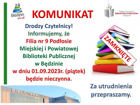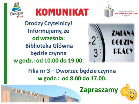 3 WRZ Komunikat dot. godzin otwarcia Biblioteki Głównej oraz Filii nr 3 - Dworzec Zapraszamy w nowych godzinach otwarcia!
