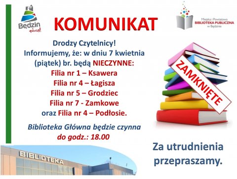 6 KWI Komunikat dot. zamknięcia filii MiPBP w Będzinie w dniu 7 kwietnia 2023r. Przepraszamy za utrudnienia.