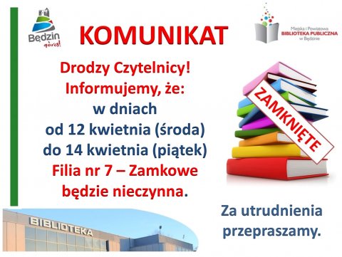 12 KWI Komunikat dot. zamknięcia Filii nr 7 - Zamkowe w dniach od 12 do 14 kwietnia 2023 r. Za utrudnienia przepraszamy.