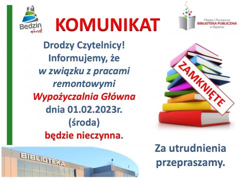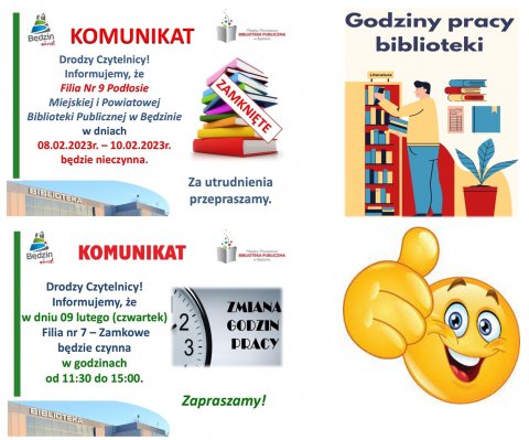 8 LUT Komunikat dot. zmiany godzin otwarcia Biblioteki Drodzy Czytelnicy! Informujemy, że Filia Nr 9 Podłosie Miejskiej i Powiatowej Biblioteki Publicznej w Będzinie w dniach od 08.02.2023r. do 10.02.2023r. będzie....