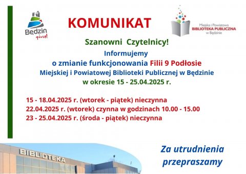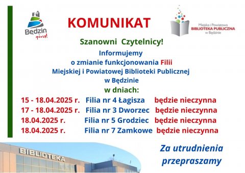 15 KWI Komunikat dot. pracy filii bibliotecznych w dniach 15 - 18 kwietnia br. Za zaistniałe utrudnienia przepraszamy.