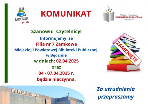 31 MAR Komunikat dot. pracy Filii nr 1 - Ksawera oraz Filii nr 9 - Podłosie Za utrudnienia przepraszamy.