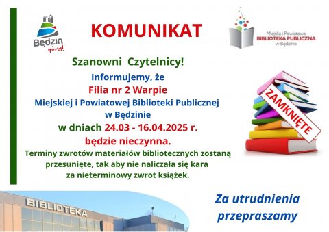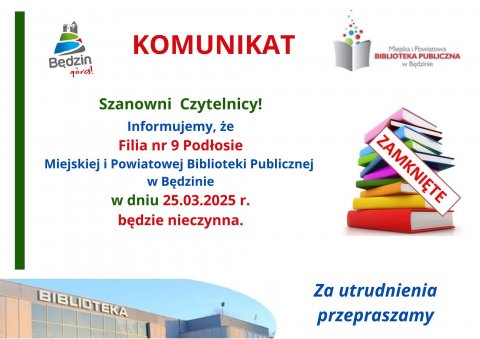 27 MAR Komunikat dot. pracy Filii MiPBP w Będzinie w dniu 28 marca 2025 r. Za utrudnienia przepraszamy.