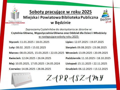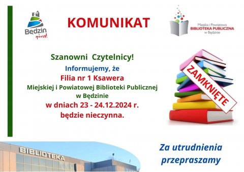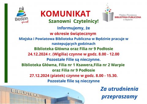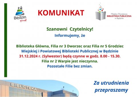 30 GRU Komunikat dot. pracy Miejskiej i Powiatowej Biblioteki Publicznej w sylwestra - 31 grudnia 2024 r. Za utrudnienia przepraszamy.