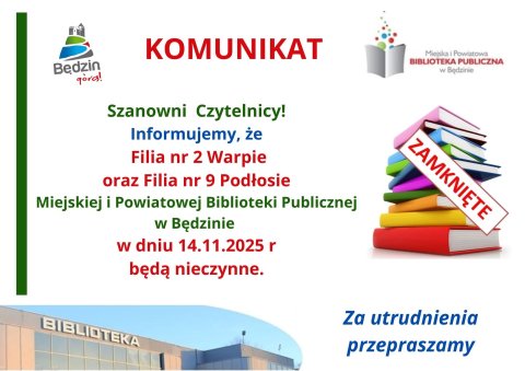 14 LIST Komunikat dot. pracy Filii nr 2 - Warpie oraz Filii nr 9 - Podłosie Za utrudnienia przepraszamy.