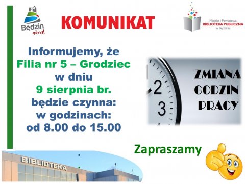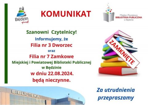 22 SIER Komunikat dot. pracy Filii nr 3 -Dworzec oraz Filii nr 7 - Zamkowe Za utrudnienia przepraszamy.