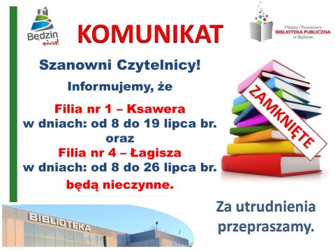 5 LIP Komunikat dot. pracy Filii nr 1 - Ksawera oraz Filii nr 4 - Łagisza Za utrudnienia przepraszamy.