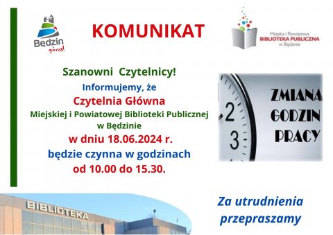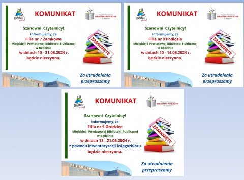 14 CZER Komunikat dot. zamknięcia filii MiPBP w Będzinie w dniu 14 czerwca oraz w dniach kolejnych. Za utrudnienia przepraszamy.