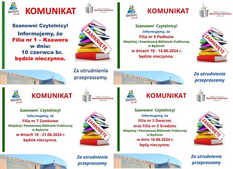 7 CZER Komunikat dot. zamknięcia filii MiPBP w Będzinie w dniu 10 czerwca oraz w dniach kolejnych. Za utrudnienia przepraszamy.