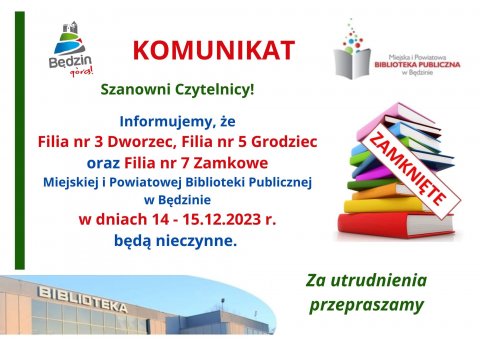 14 GRU Komunikat dot. pracy Filii nr 3 - Dworzec, 5 - Grodziec oraz 7 - Zamkowe Za utrudnienia przepraszamy.
