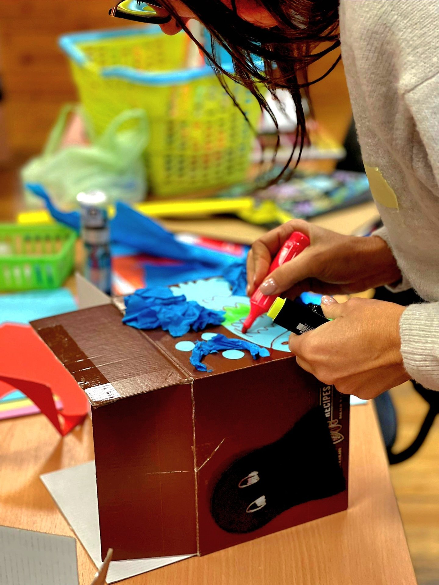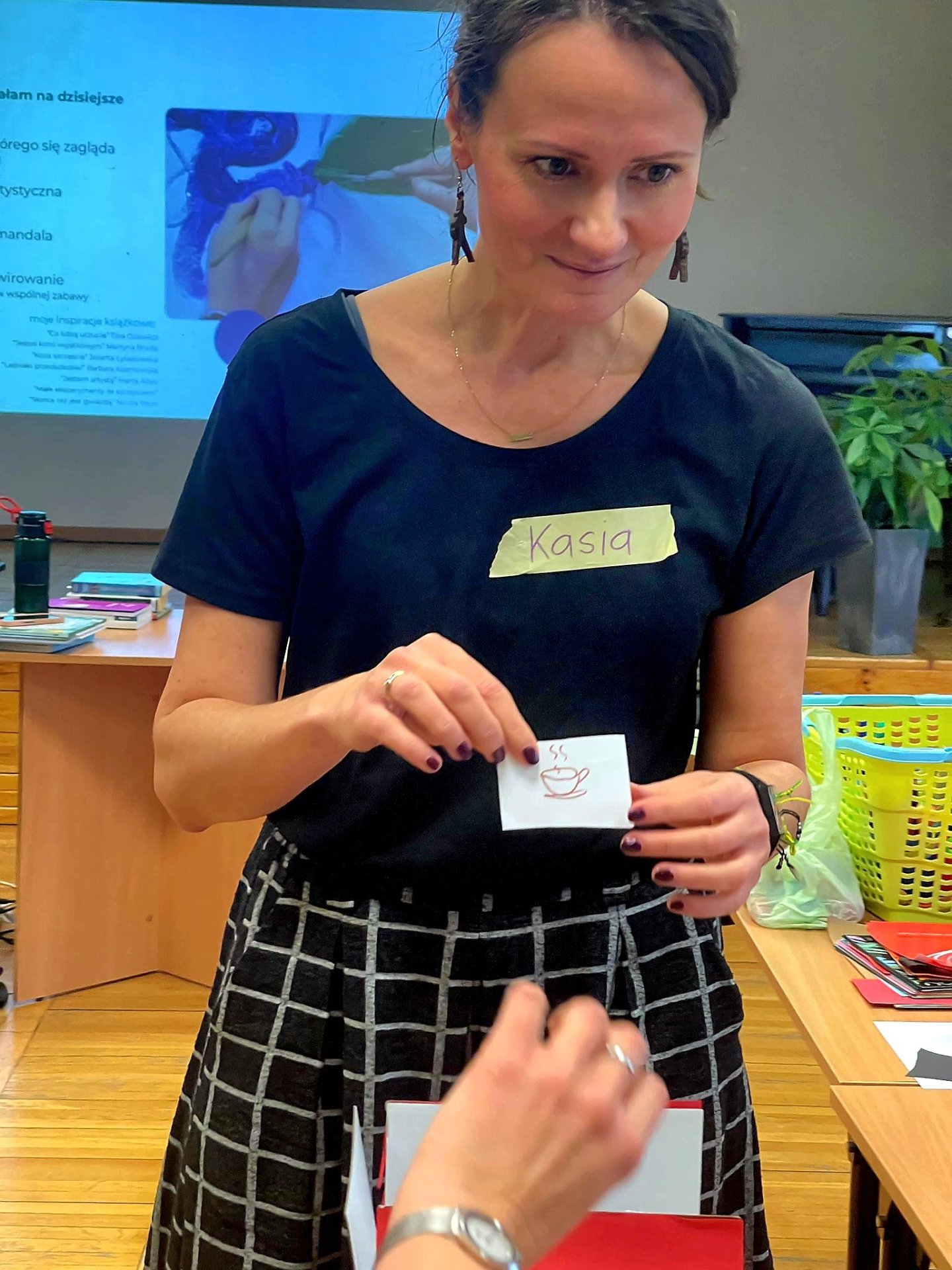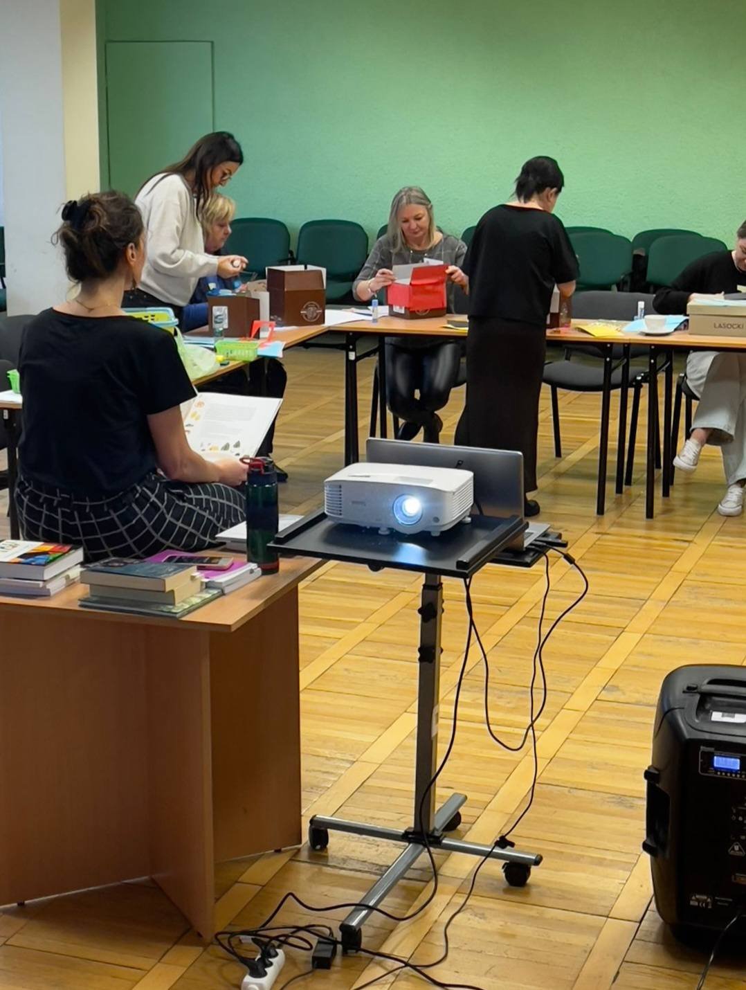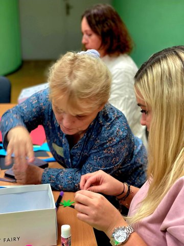 Jedną z odmian, którą warto wypróbować na sobie jest autoarteterapia. Podczas szkolenia każda z uczestniczek wykonała specjalne pudełko, w którym umieściła swoje marzenia. Na zewnątrz znalazły się obawy i lęki. To proste ćwiczenie pomaga uświadomić sobie, jak wiele wspaniałych rzeczy mamy w życiu, a jednocześnie nazwać trudności, z którymi się mierzymy. Prowadząca szkolenie, Pani Katarzyna Grysko przedstawiła ciekawe przykłady działań arteterapeutycznych od książki artystycznej i kolażowej mandali po intrygujace malowanie wirowane. Szkolenie pokazało nam arteterapii jako narzędzie, które wniesie nową, wartościową jakość do pracy z naszymi Użytkownikami – dziećmi, młodzieżą i dorosłymi.