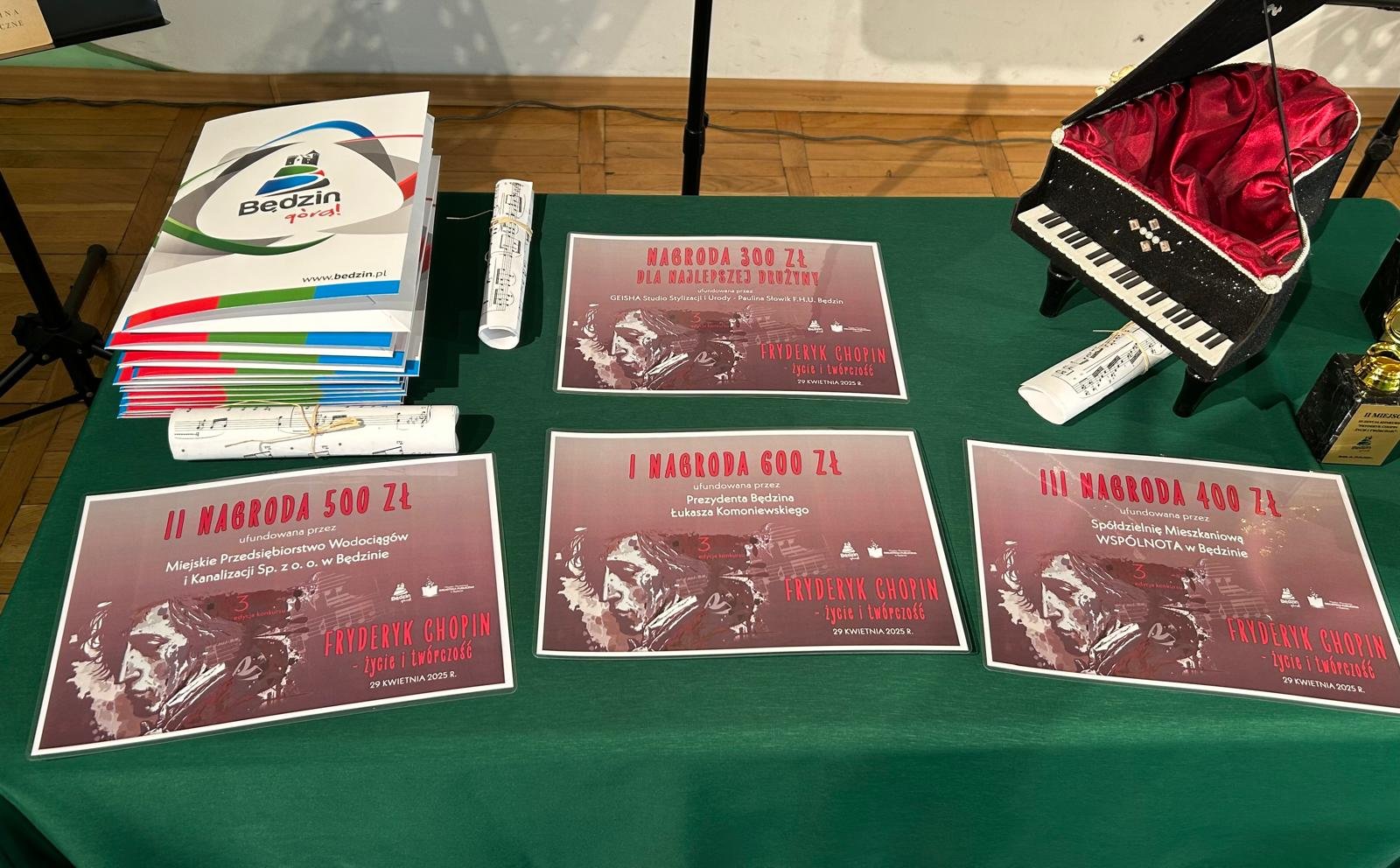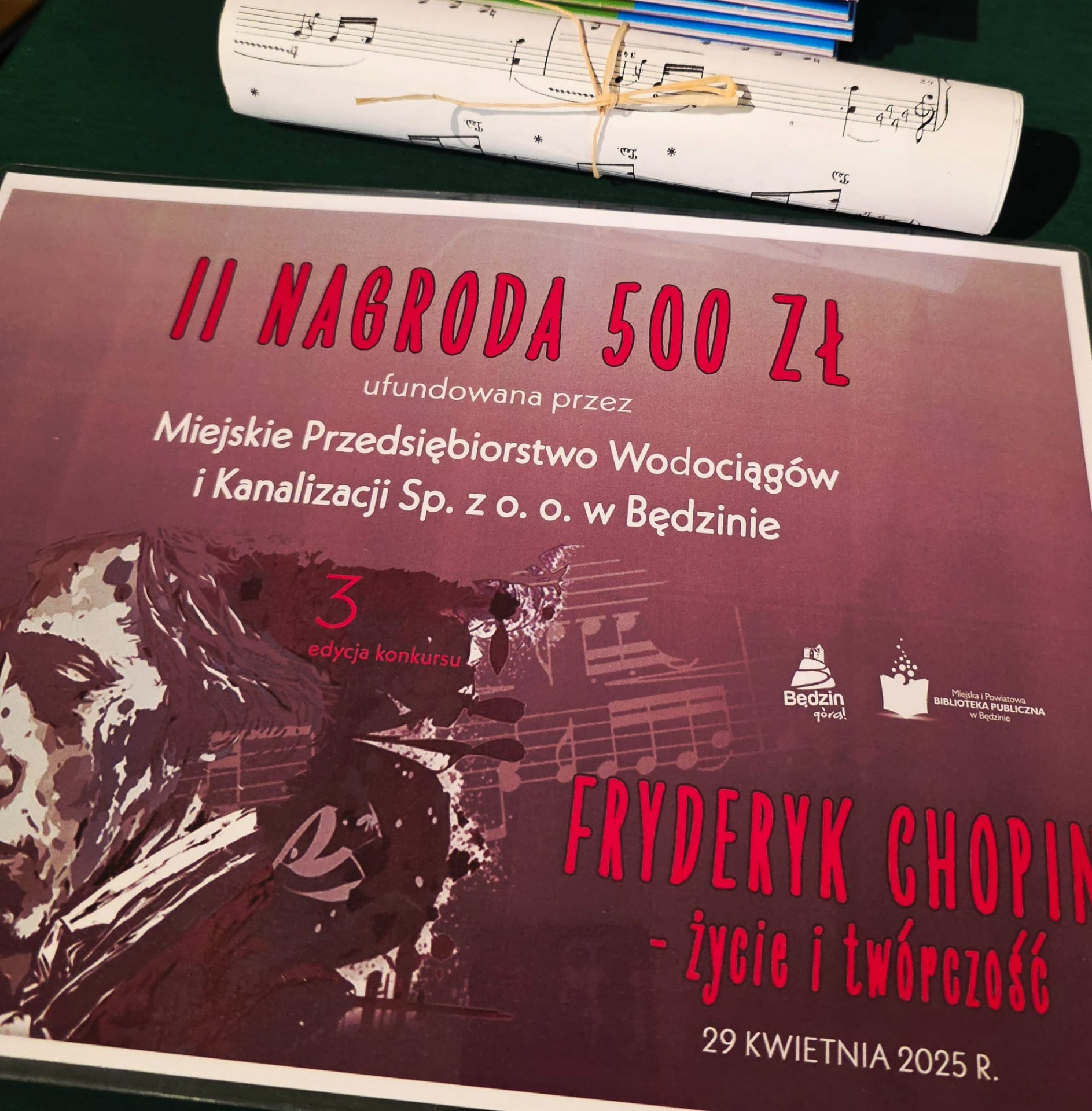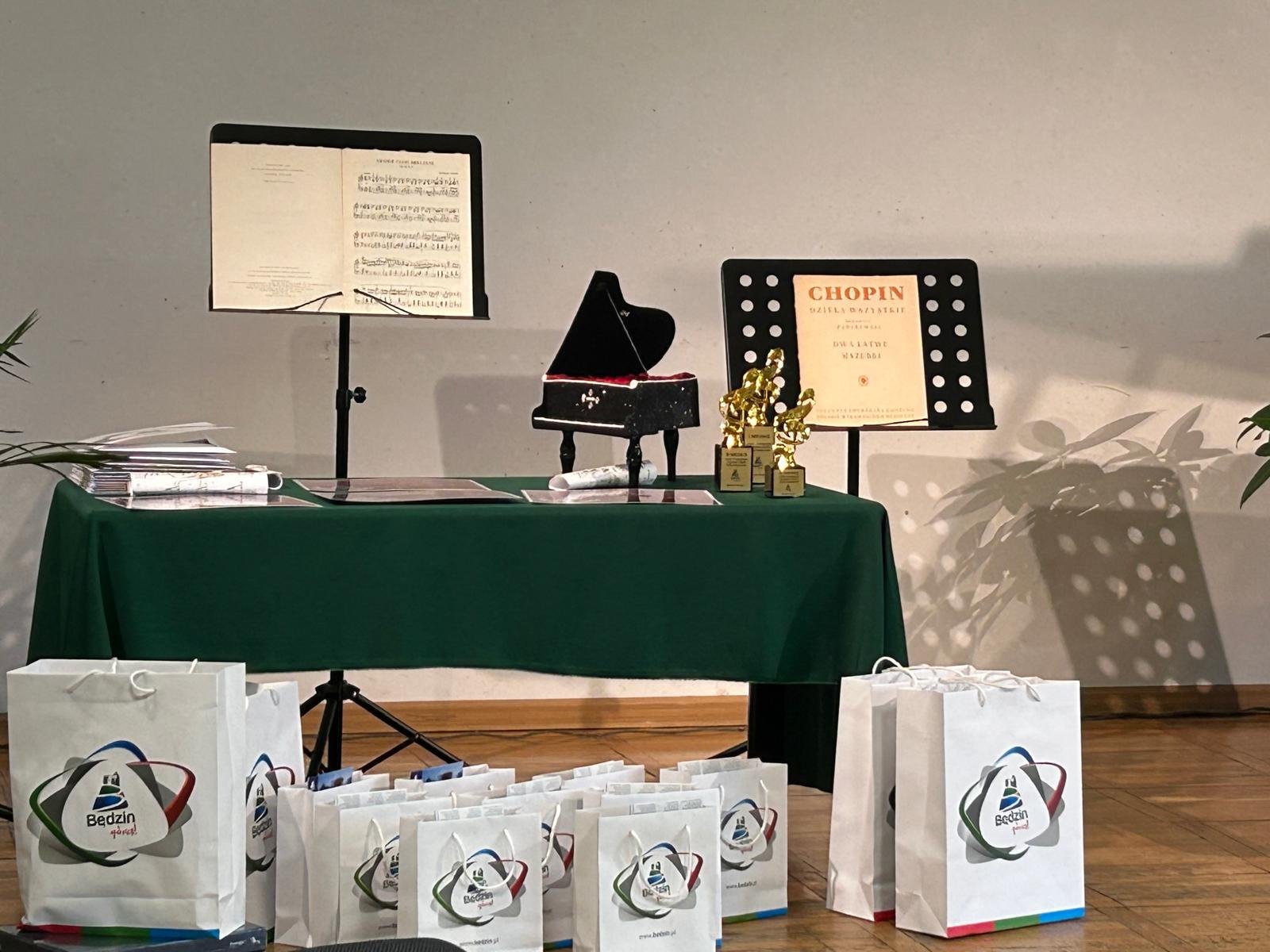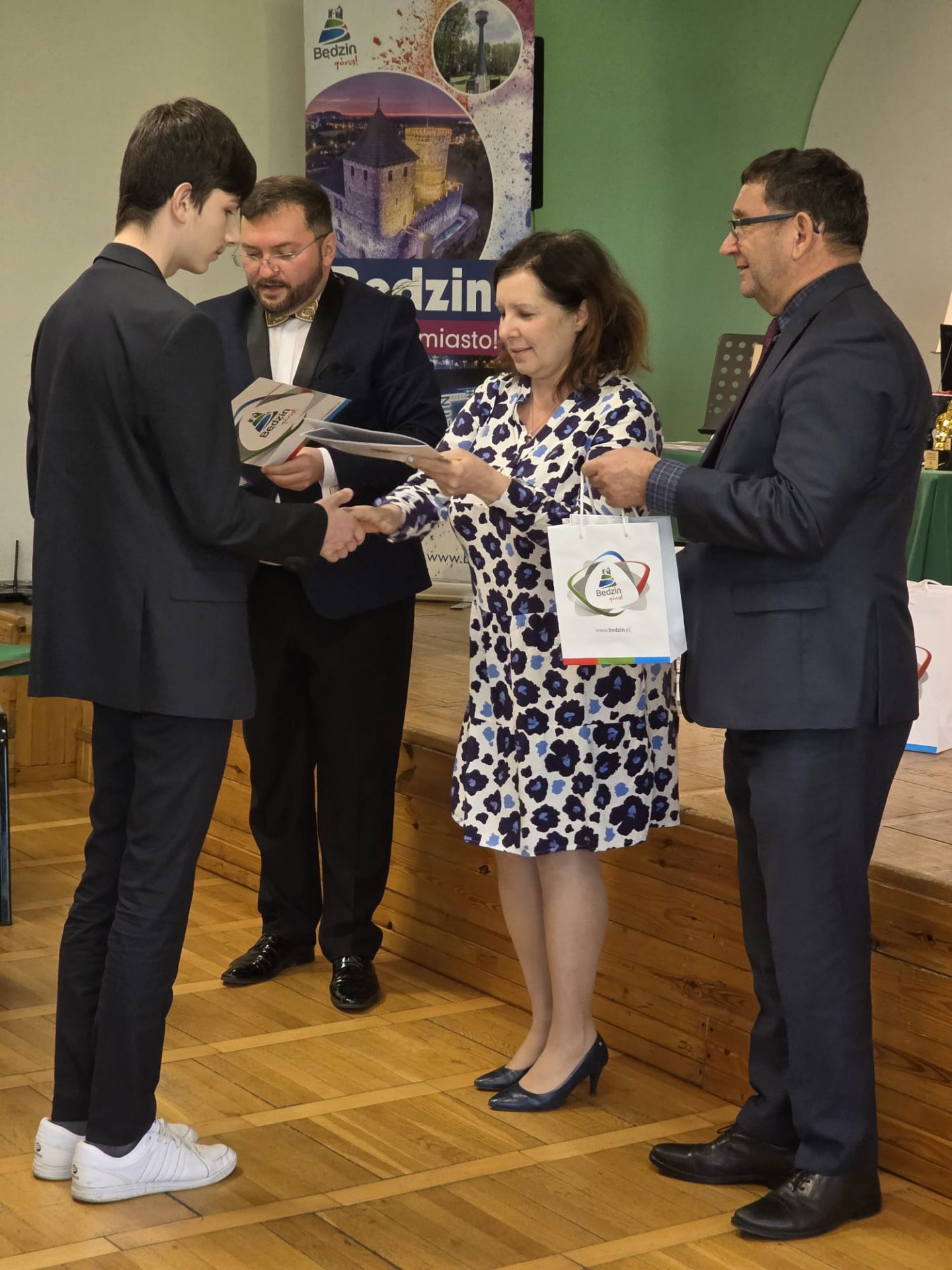 Zanim jednak rozdano nagrody przed uczestnikami konkursu wystąpił młody, doskonale zapowiadający się pianista Mateusz Dąbek z V klasy będzińskiej szkoły muzycznej, który wykonał przed zgromadzoną publicznością Walc Des – dur oraz Fantazję-Impromptu cis-moll op. 66. - posłuchajcie sami. Przed Mateuszem maluje się prawdziwa pianistyczna kariera – w swoim dorobku ma liczne nagrody. Zajął I miejsce w swojej grupie oraz otrzymał GRAND PRIX w VII Międzynarodowym Podkarpackim Konkursie Chopinowskim w Rzeszowie. Na zaproszenie Instytutu Fryderyka Chopina w Warszawie Mateusz Dąbek wykona recital w Domu Urodzenia Fryderyka Chopina w Żelazowej Woli. Cieszymy się z sukcesów naszej uzdolnionej młodzieży oraz z faktu zainteresowania sztuką, muzyką a także samą postacią Fryderyka Chopina, który jest naszym dobrem narodowym.