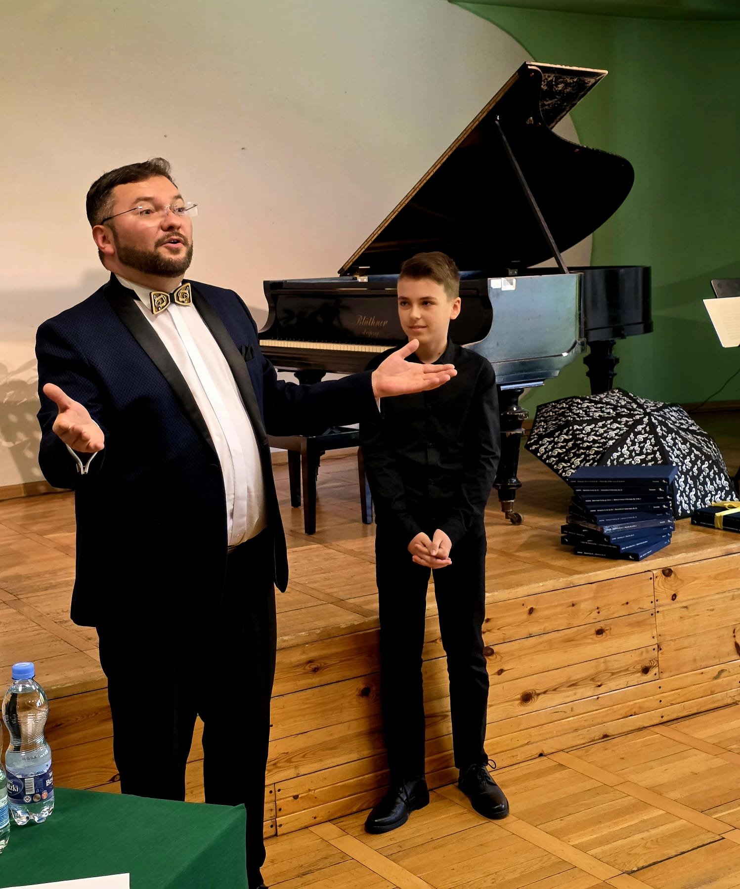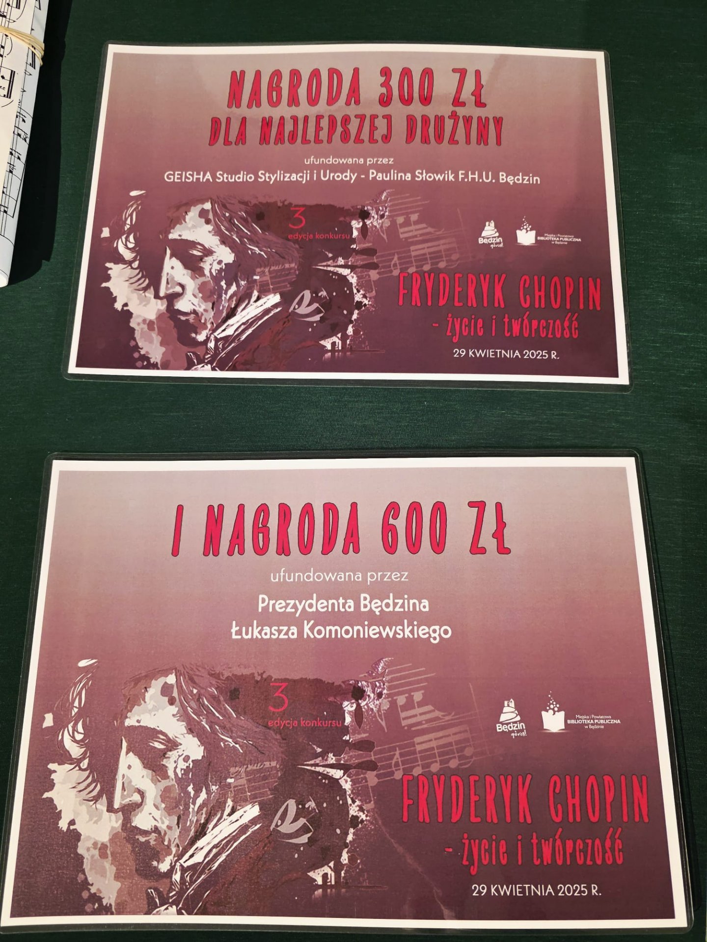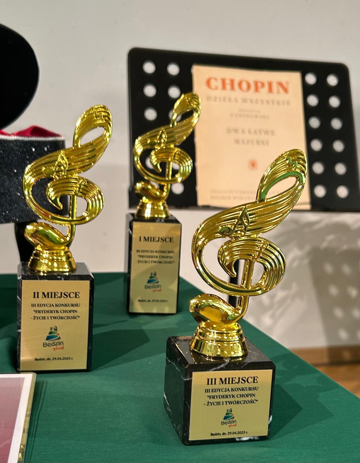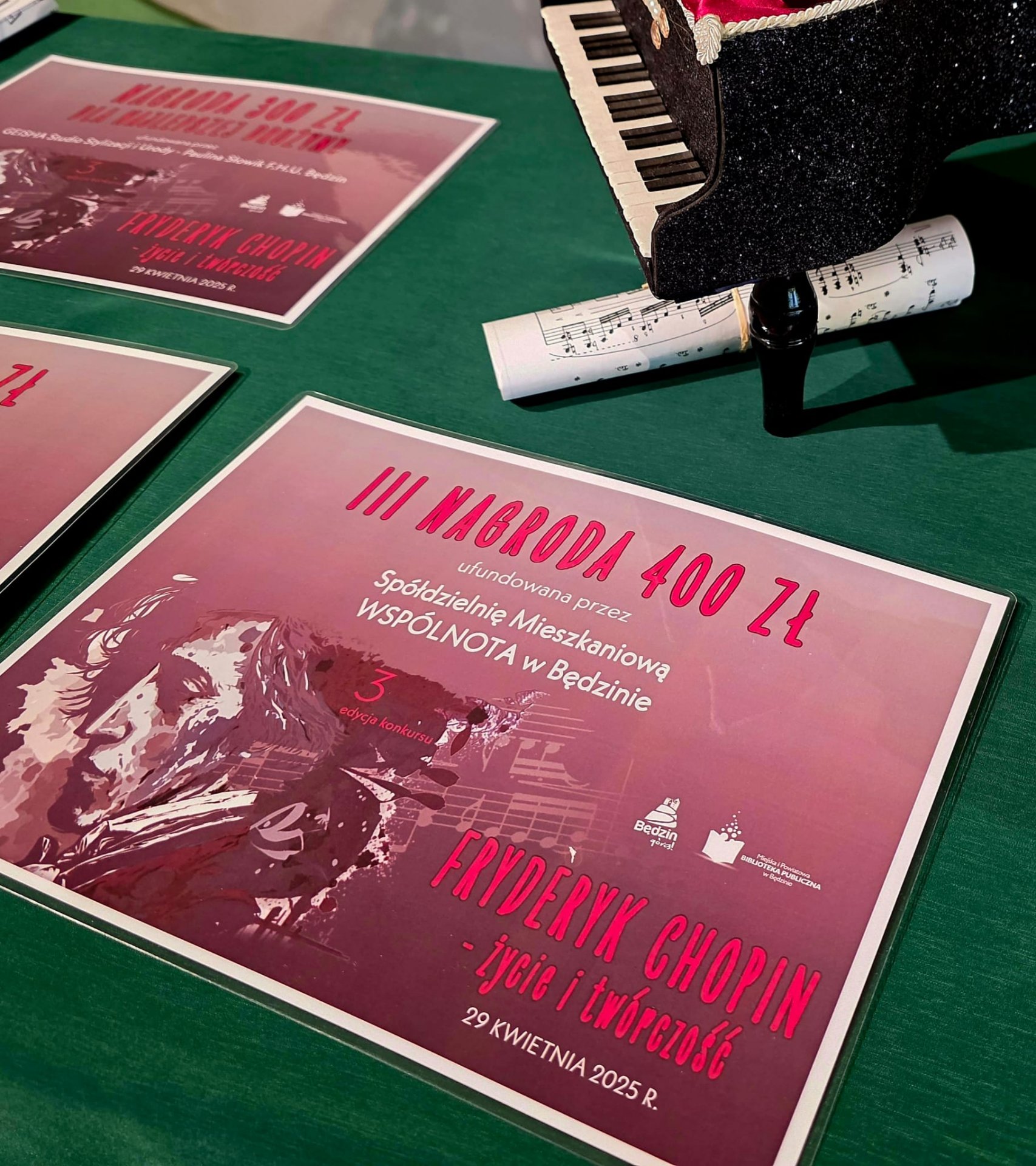 Zanim jednak rozdano nagrody przed uczestnikami konkursu wystąpił młody, doskonale zapowiadający się pianista Mateusz Dąbek z V klasy będzińskiej szkoły muzycznej, który wykonał przed zgromadzoną publicznością Walc Des – dur oraz Fantazję-Impromptu cis-moll op. 66. - posłuchajcie sami. Przed Mateuszem maluje się prawdziwa pianistyczna kariera – w swoim dorobku ma liczne nagrody. Zajął I miejsce w swojej grupie oraz otrzymał GRAND PRIX w VII Międzynarodowym Podkarpackim Konkursie Chopinowskim w Rzeszowie. Na zaproszenie Instytutu Fryderyka Chopina w Warszawie Mateusz Dąbek wykona recital w Domu Urodzenia Fryderyka Chopina w Żelazowej Woli. Cieszymy się z sukcesów naszej uzdolnionej młodzieży oraz z faktu zainteresowania sztuką, muzyką a także samą postacią Fryderyka Chopina, który jest naszym dobrem narodowym.