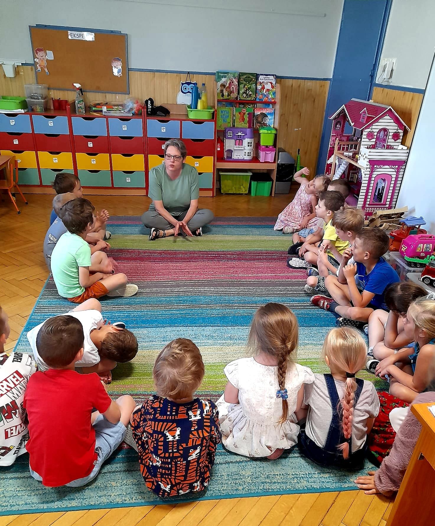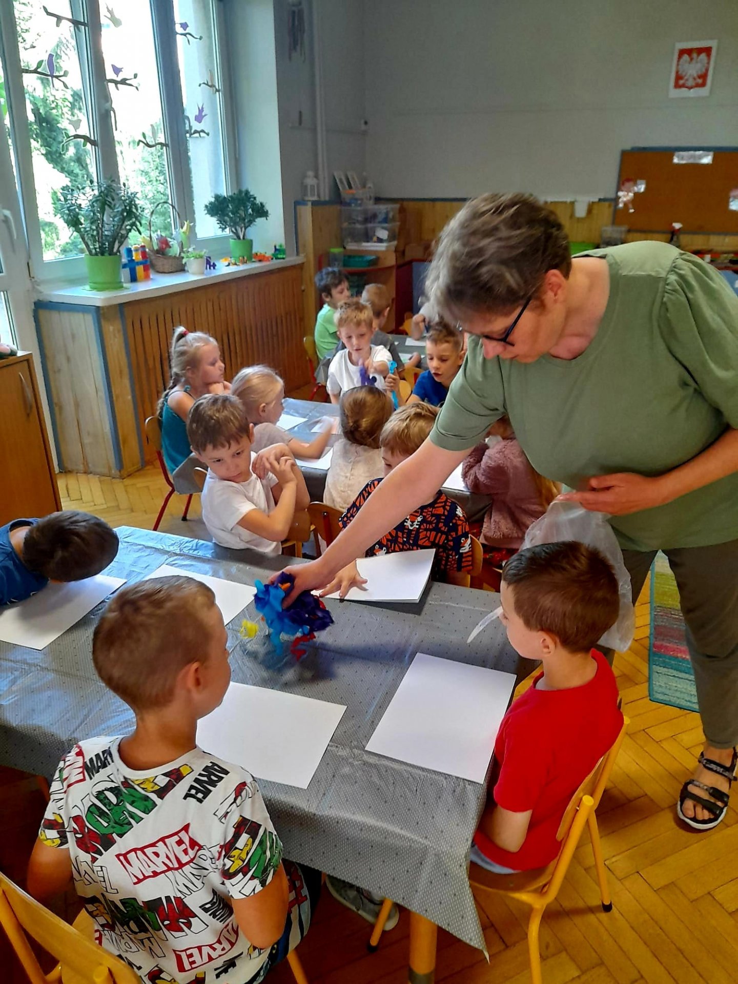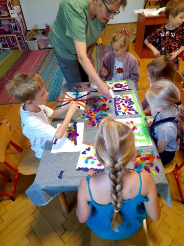 W ramach cyklu zajęć edukacyjnych "Niezawodne wakacje, czyli jak bezpiecznie i wesoło bawić się latem" bibliotekarz Filii nr 3 Dworzec odwiedził w piątek grupę starszaków z Przedszkola Miejskiego nr 9 w Będzinie. Spotkanie rozpoczęło się od zabawy - malowania bibułą wakacyjnych obrazów. Dzieci na kartkach układały różne wzory, a następnie prace zostały spryskane wodą. W czasie, gdy kartki schły, przedszkolaki wysłuchały opowiadania autorstwa Gabrieli Rzepeckiej - Weiss "Gdy pola się zgubi". Śledząc perypetie bohaterki, która wybrała się z rodzicami w podroż do Hiszpanii, starszaki dowiedziały się, jak się zachować, gdy się zgubią. Przede wszystkim powinny poprosić o pomoc kogoś ze służb mundurowych, nie szukać rodziców, tylko czekać, aż oni je znajdą, nie ufać nieznajomym ludziom, być uważnym i nie zbliżać się do jezdni. Na zakończenie przedszkolaki z suchych kartek zdjęły bibułę i zaprezentowały swoje oryginalne, letnie impresje.
