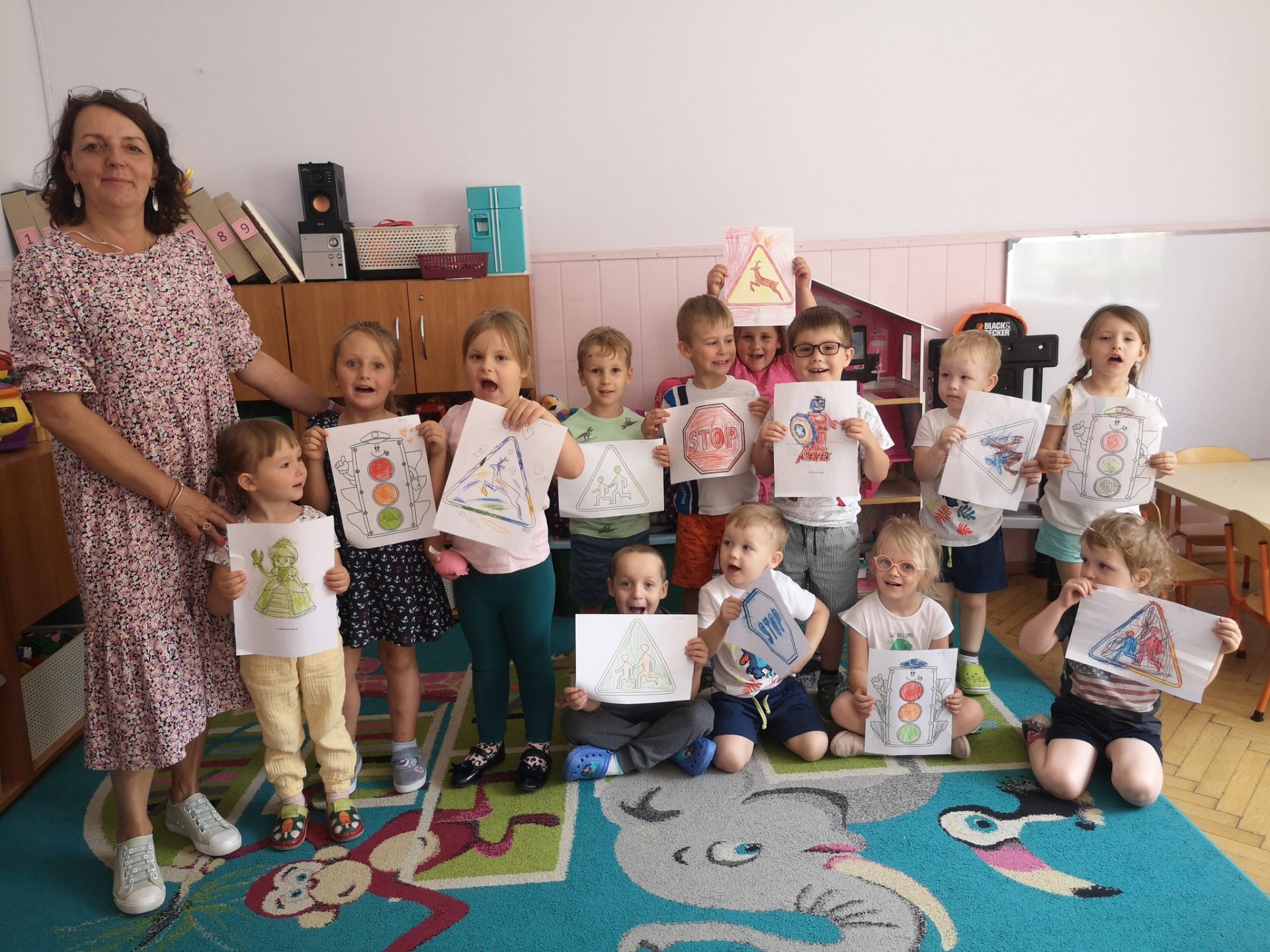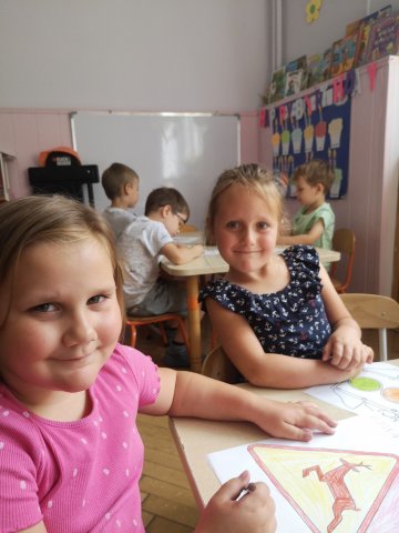 Podstawą do dyskusji były przeczytane książeczki Katarzyny Moryc "Na drodze" i "Apteczka". Z pierwszej dzieci dowiedziały się o kilku podstawowych zasadach bezpieczeństwa na drodze,poznały znaki drogowe oraz reguły działania sygnalizacji świetlnej. Z drugiej książki przedszkolaki uzyskały informacje, jak korzystać z apteczki i jak zachować się w momentach zagrożenia. Dla utrwalenia wiadomości dzieci z chęcią kolorowały wybrane przez siebie znaki drogowe.