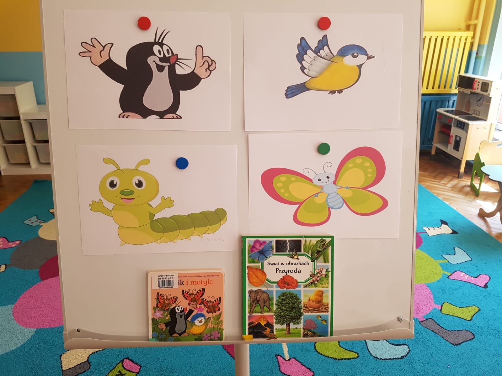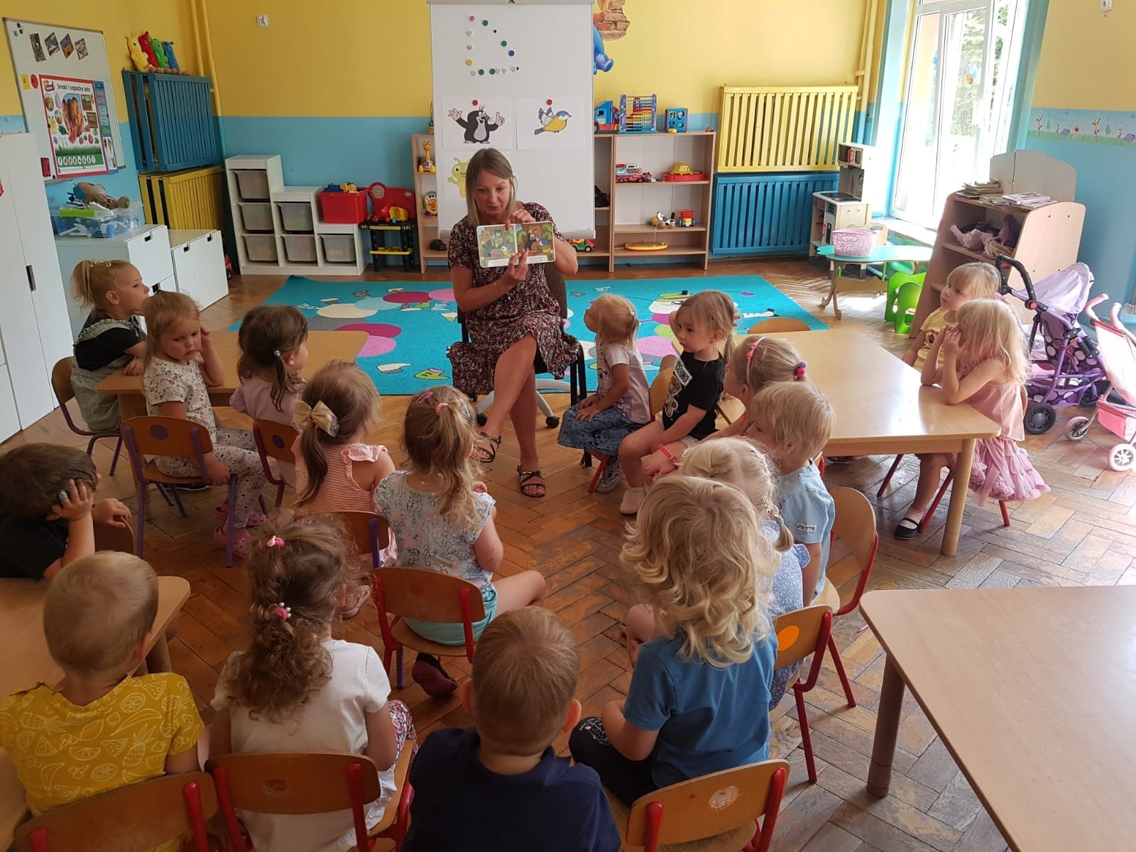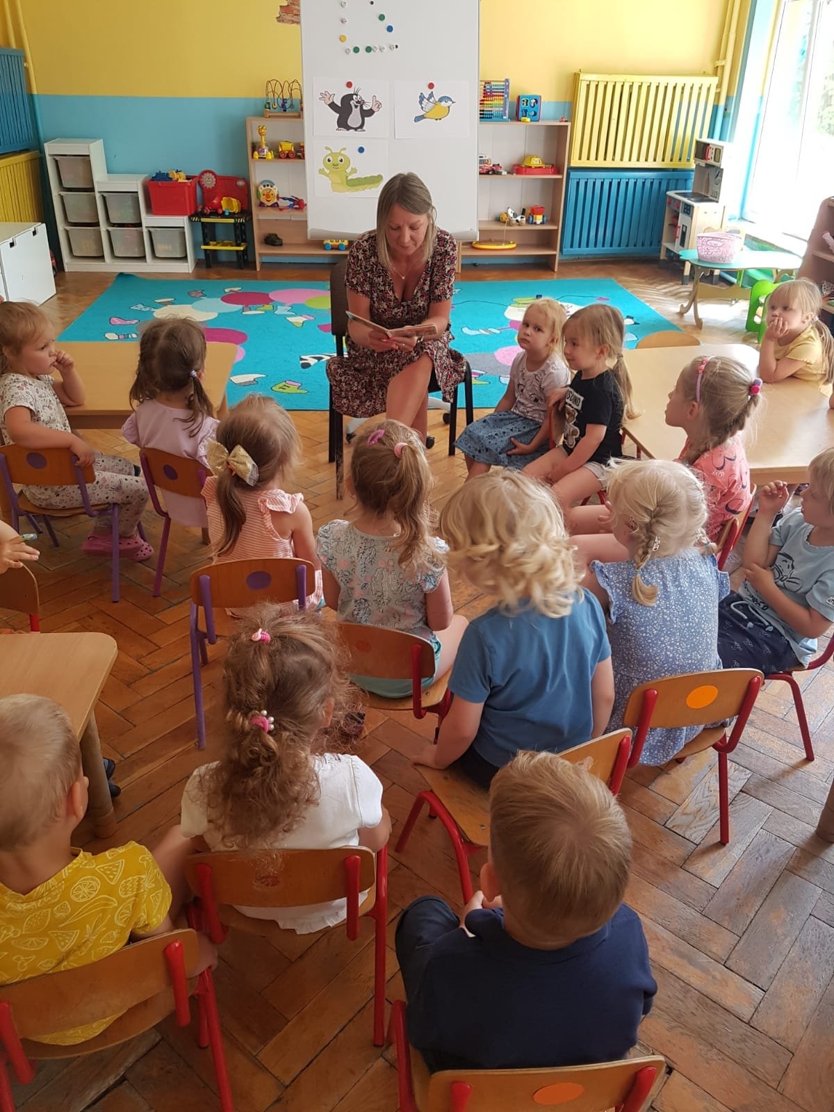19 lipca kolejny raz bibliotekarz Filii nr 5 w Grodźcu odwiedził dzieci z Przedszkola Miejskiego nr 14 w Będzinie. „Bajkowe stworki wychodzą z norki” to zajęcia plastyczno – literackie jakie odbyły się w najmłodziej grupie przedszkolaków. Dzieci poznały przesympatycznego KRECIKA bohatera opowiadania Małgorzaty Strzałkowskiej „Krecik i motyle”. Z przeczytanej bajki dowiedziały się, jak Krecik i sikorka ratują ogródek przed gąsienicami oraz skąd biorą się motyle. Tygryski poznały proces rozwoju motyla, od jajeczka, poprzez gąsienicę, poczwarkę, aż do motyla. Oglądanie obrazków przedstawiających ten proces bardzo zaciekawił maluchy. To, że motyle są najpiękniejszymi owadami i że można je spotkać przede wszystkim w miejscach, gdzie jest dużo kwiatów to, wiedziały.