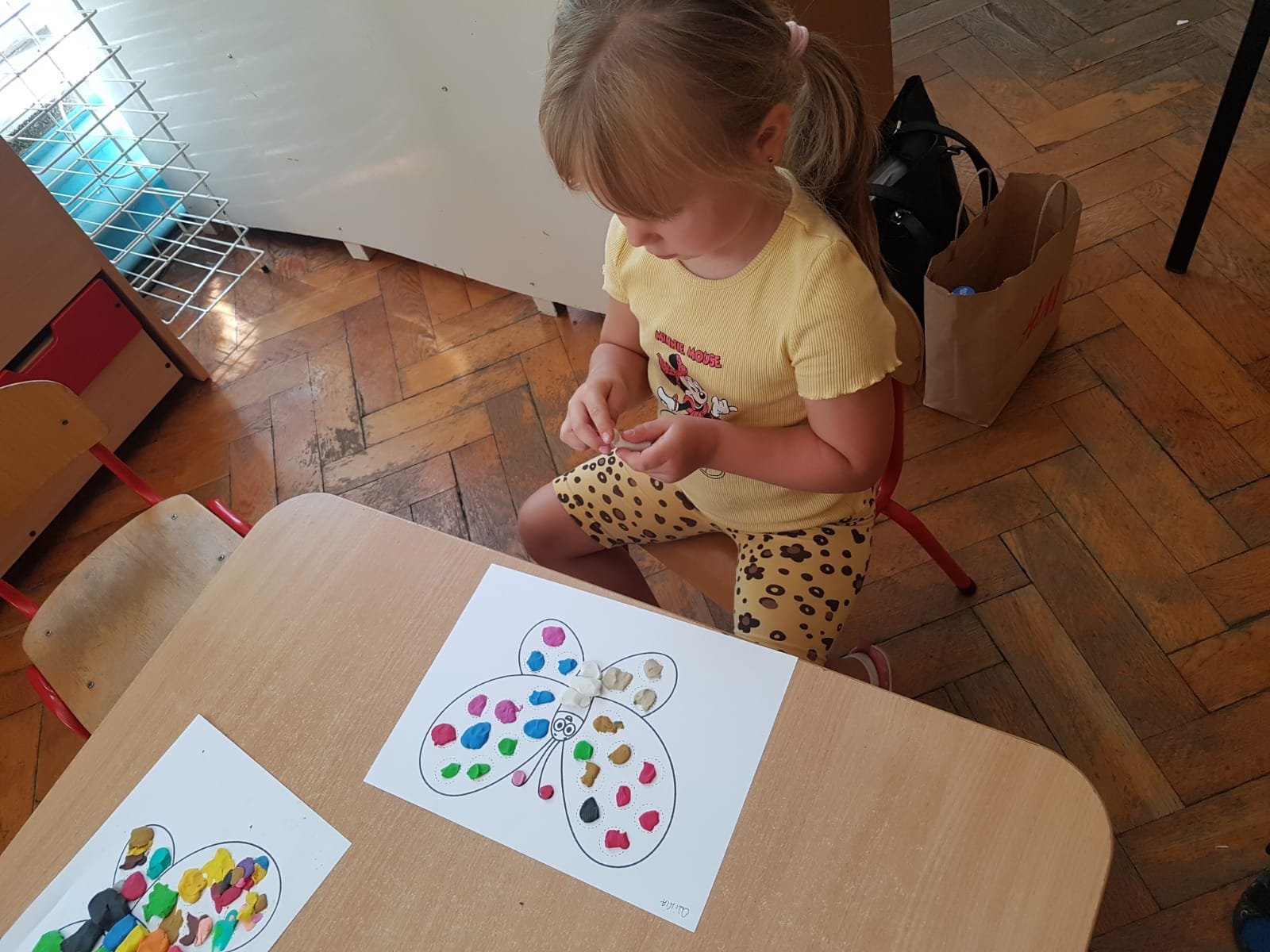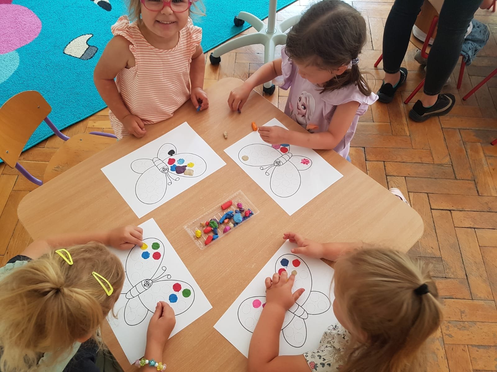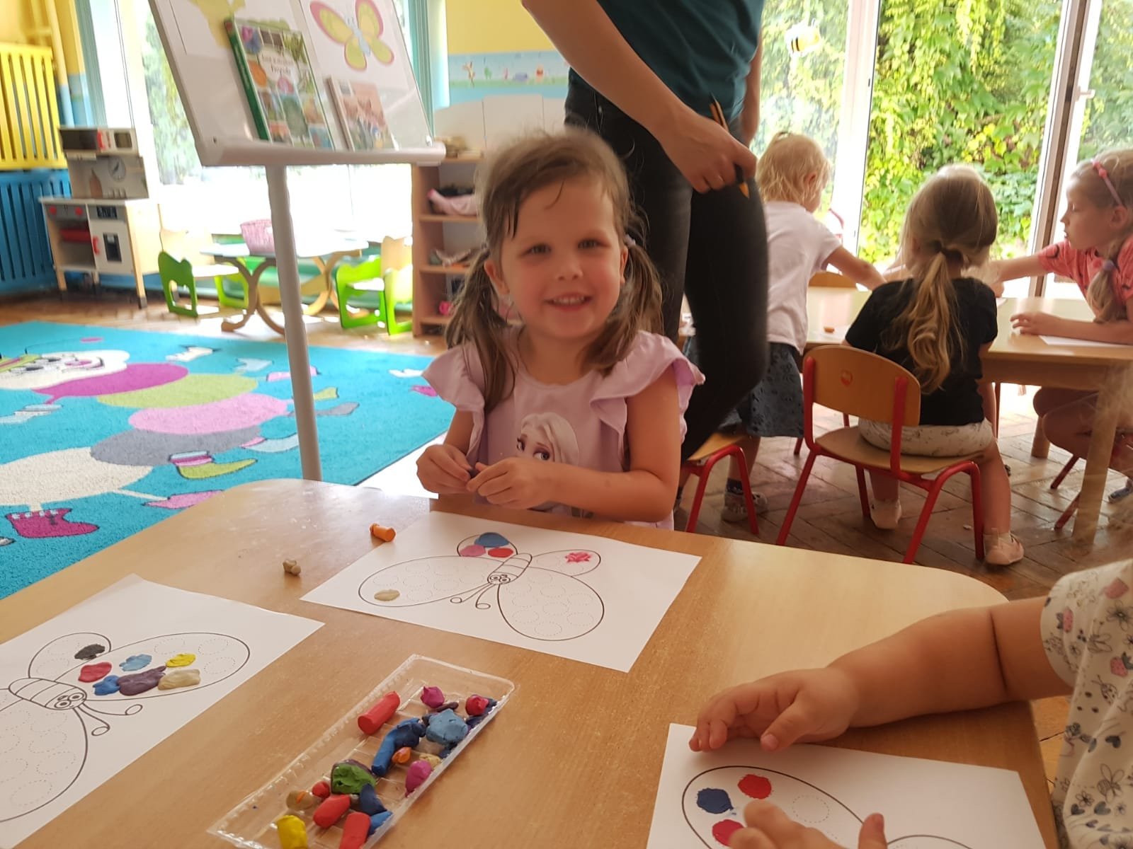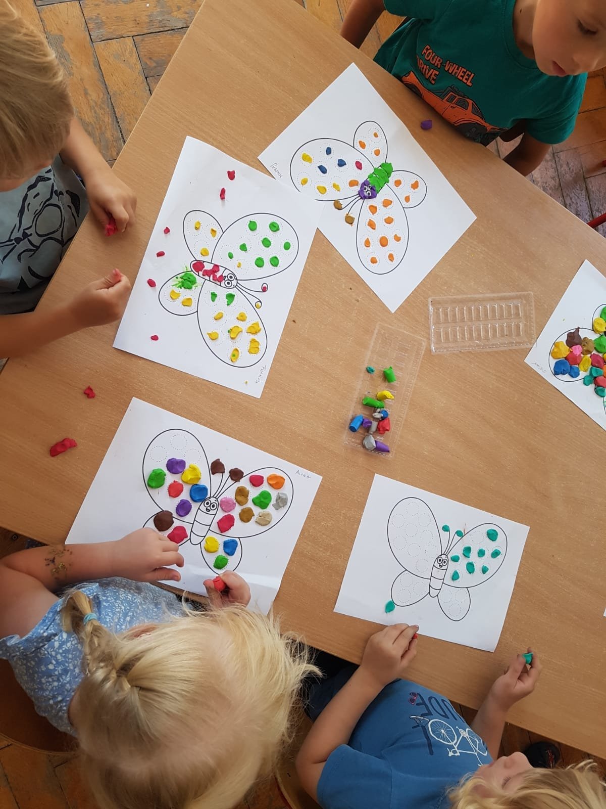 Ale, nie wiedziały, że motyle mają bardzo ważne zadanie do wykonania – zapylanie kwiatków – co pozwala roślinkom prawidłowo się rozwijać. Na zakończenie maluszki wyklejały motylka kuleczkami z plasteliny. To zajęcie dość trudne i żmudne, ale efekt końcowy bardzo ciekawy.