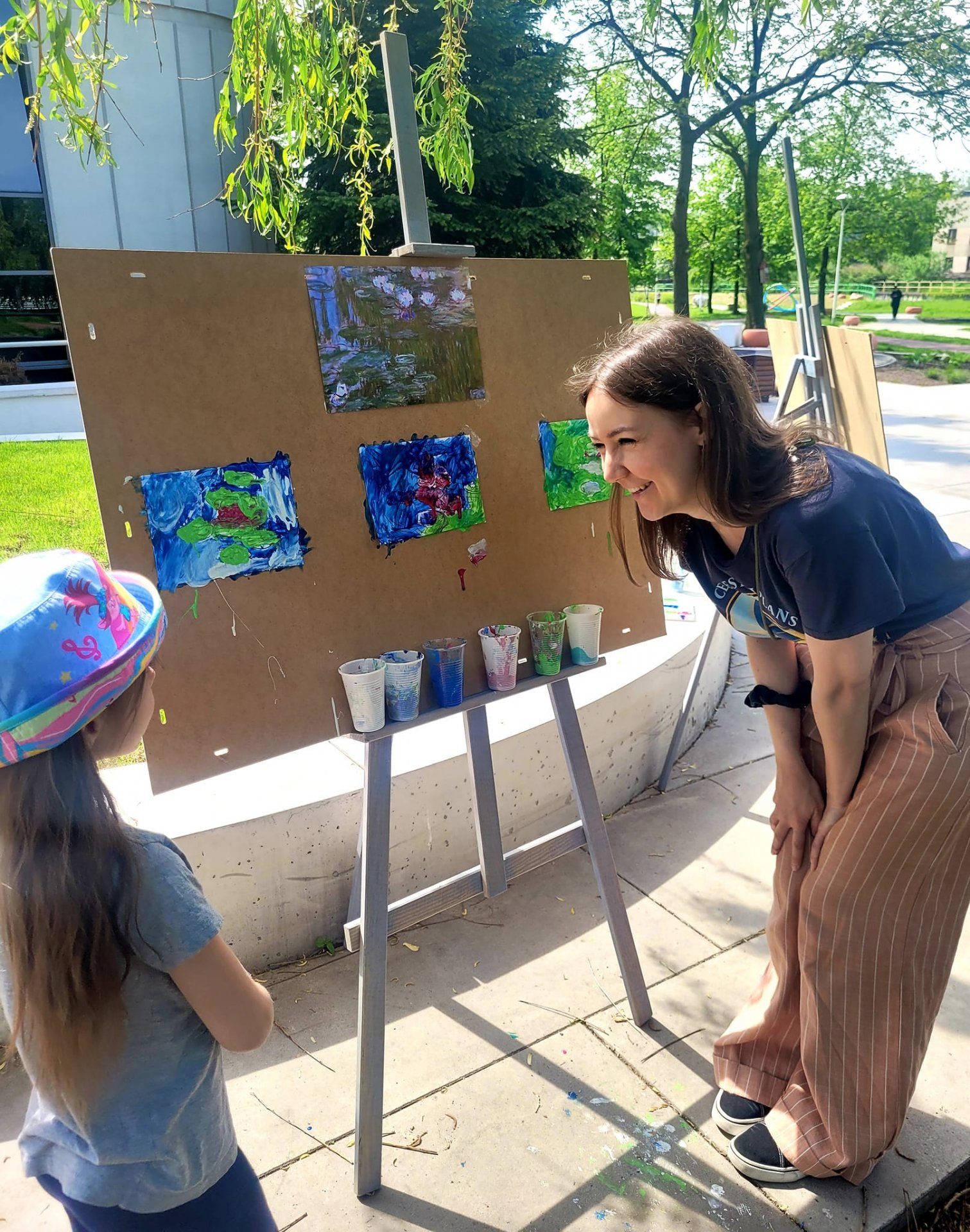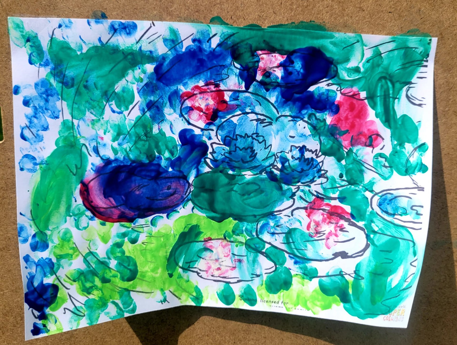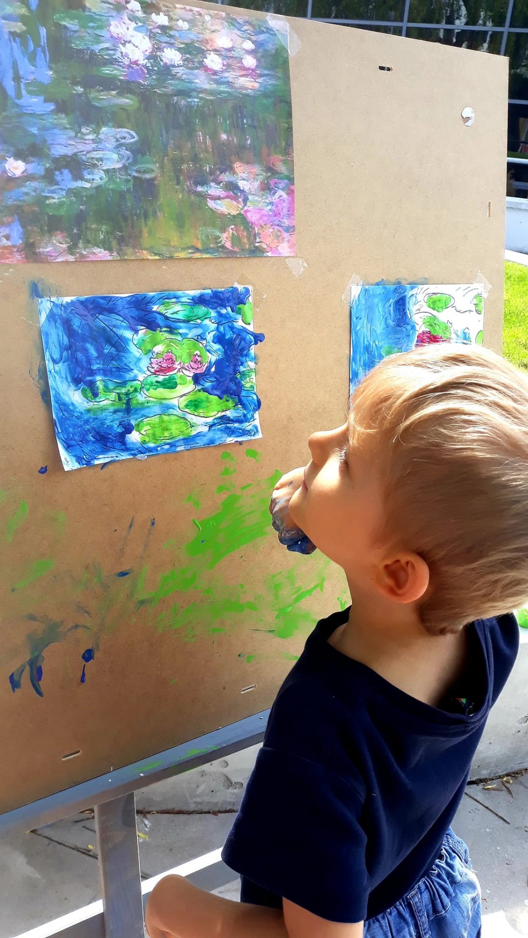 Pełne motywacji przedszkolaki ruszyły w plener by spróbować swoich sił w malarstwie. Podczas twórczej pracy powstało wiele pięknych obrazów odwzorowujących słynne Nenufary. Zwieńczeniem zajęć było wysłuchanie magicznej historii zawartej w książce pt. "Claude Monet i jego ogrody" autorstwa Laurence Anholt.