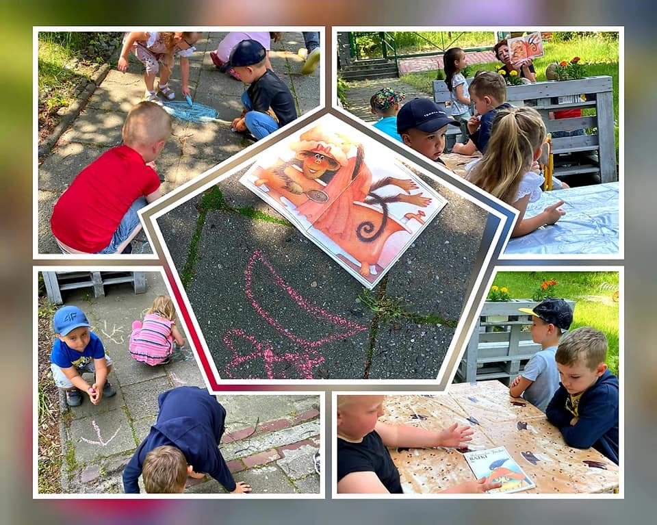 Czerwiec na Podłosiu, należy do Patrona Roku 2023 - Aleksandra Fredry, przeczytano więc z przedszkolakami bajki : „Małpa”, „Osioł” i „Koguty”, by potem przedszkolaki mogły zilustrować wierszyki kredą. Nie ma bowiem, jak czytanie i zabawa na świeżym powietrzu.