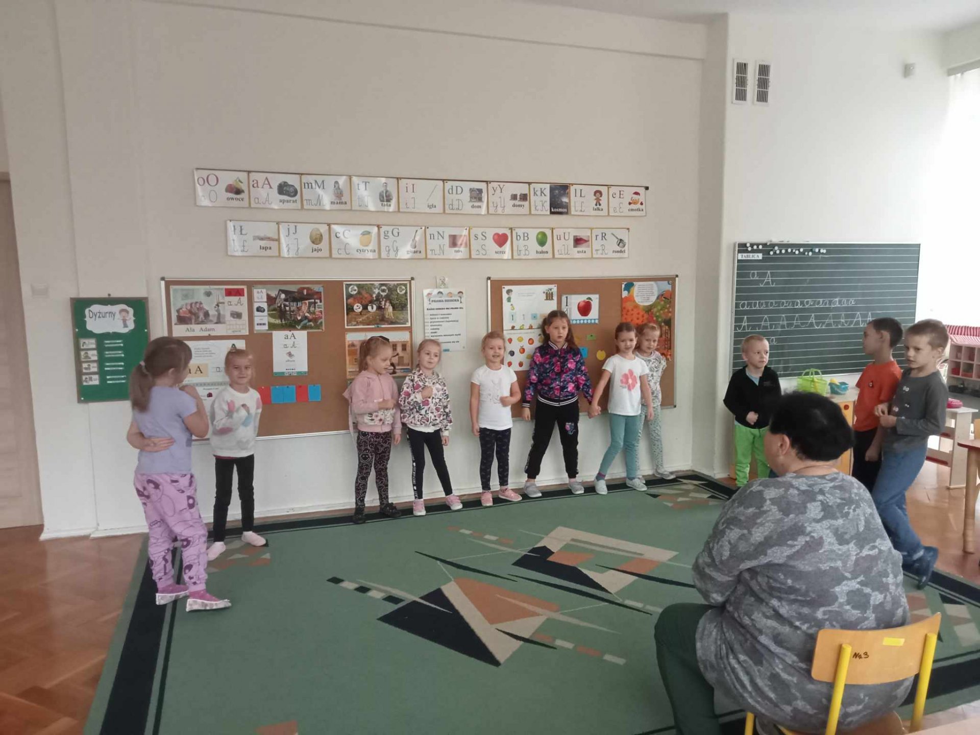 Na podstawie opowiadania Iriny Prokopienko „Jak brzoza liście rozdawała” przedszkolaki opowiadały jakimi kolorami jesień maluje liście na drzewach. Potem starały się znaleźć w tekście literackim odpowiedzi na pytania, jakie drzewo było bohaterem dzisiejszego opowiadania, kto występował w opowiadaniu, dlaczego brzoza zasmuciła się i kto ją pocieszył?
