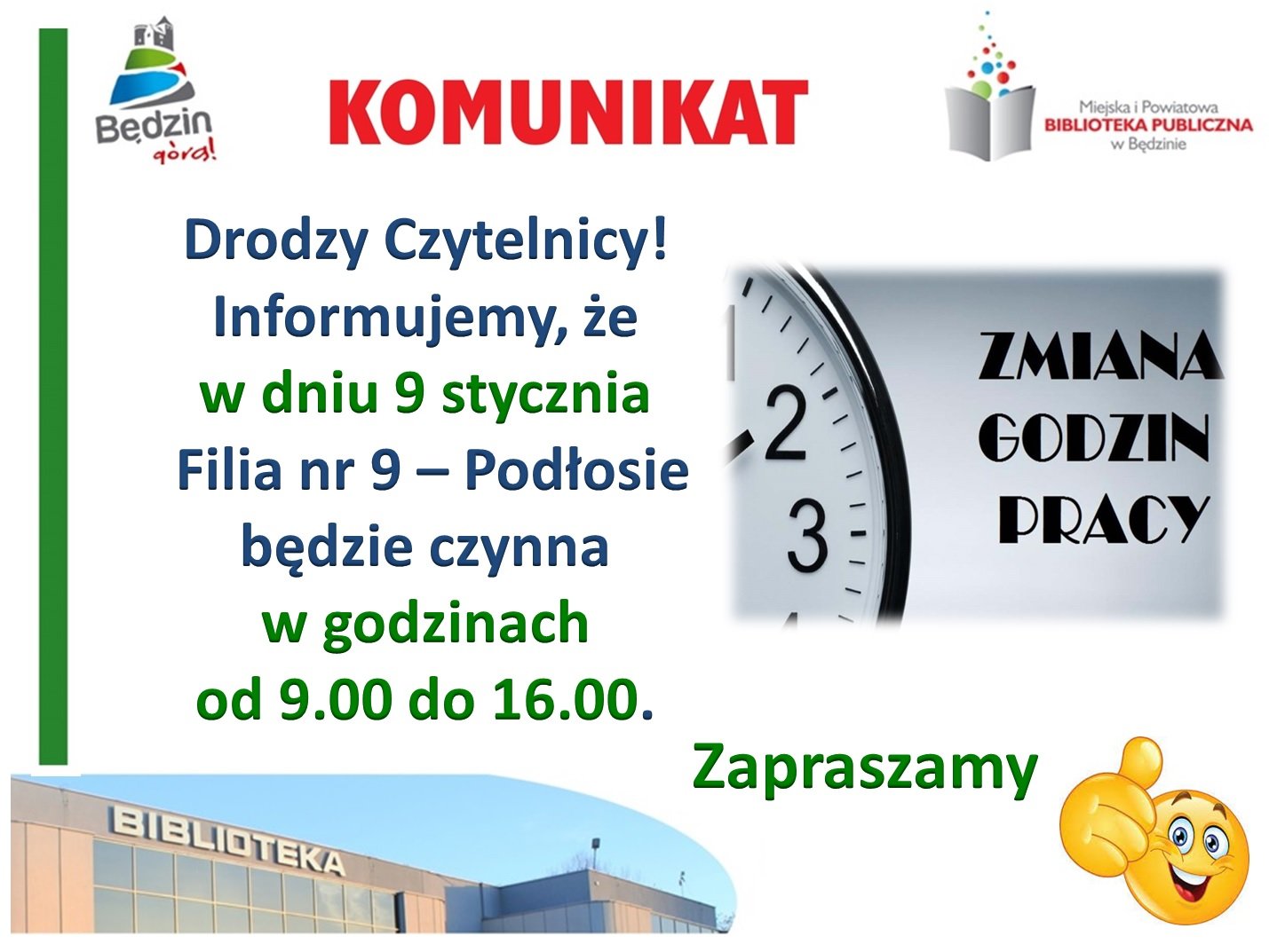 Komunikat dot. pracy Filii nr 9 - Podłosie w dniu 9 stycznia br.