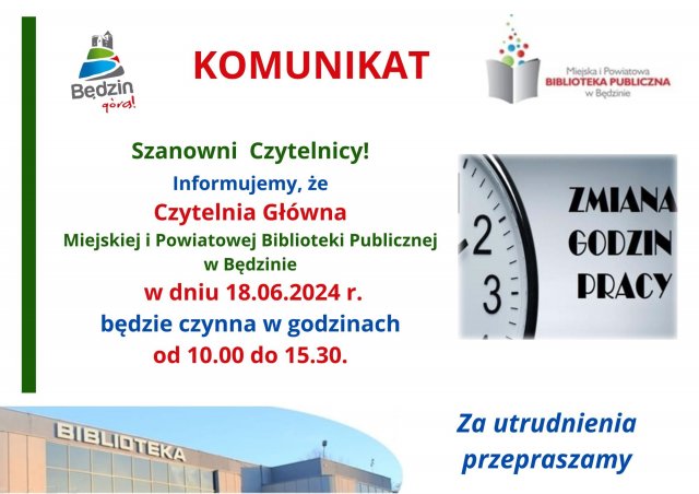 Szanowni Czytelnicy, informujemy, że Czytelnia Główna w dniu 18 czerwca (wtorek) br. będzie czynna w godz.: od 10.00 do 15.30. Za utrudnienia przepraszamy.