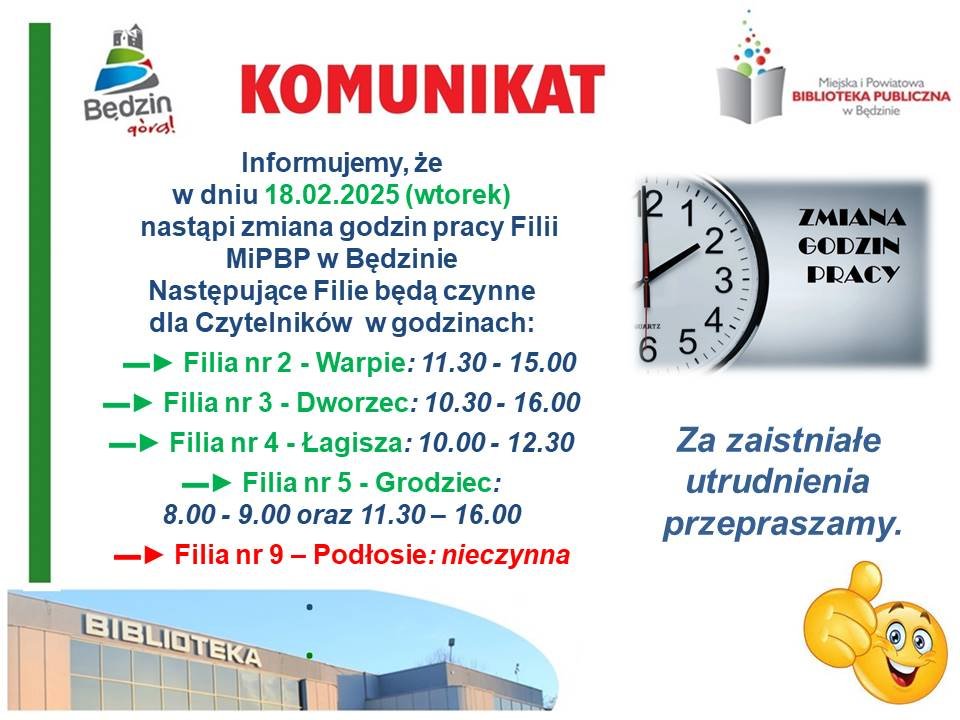 Informujemy, że w dniu 18.02.2025 (wtorek) nastąpi zmiana godzin pracy Filii MiPBP w Będzinie.