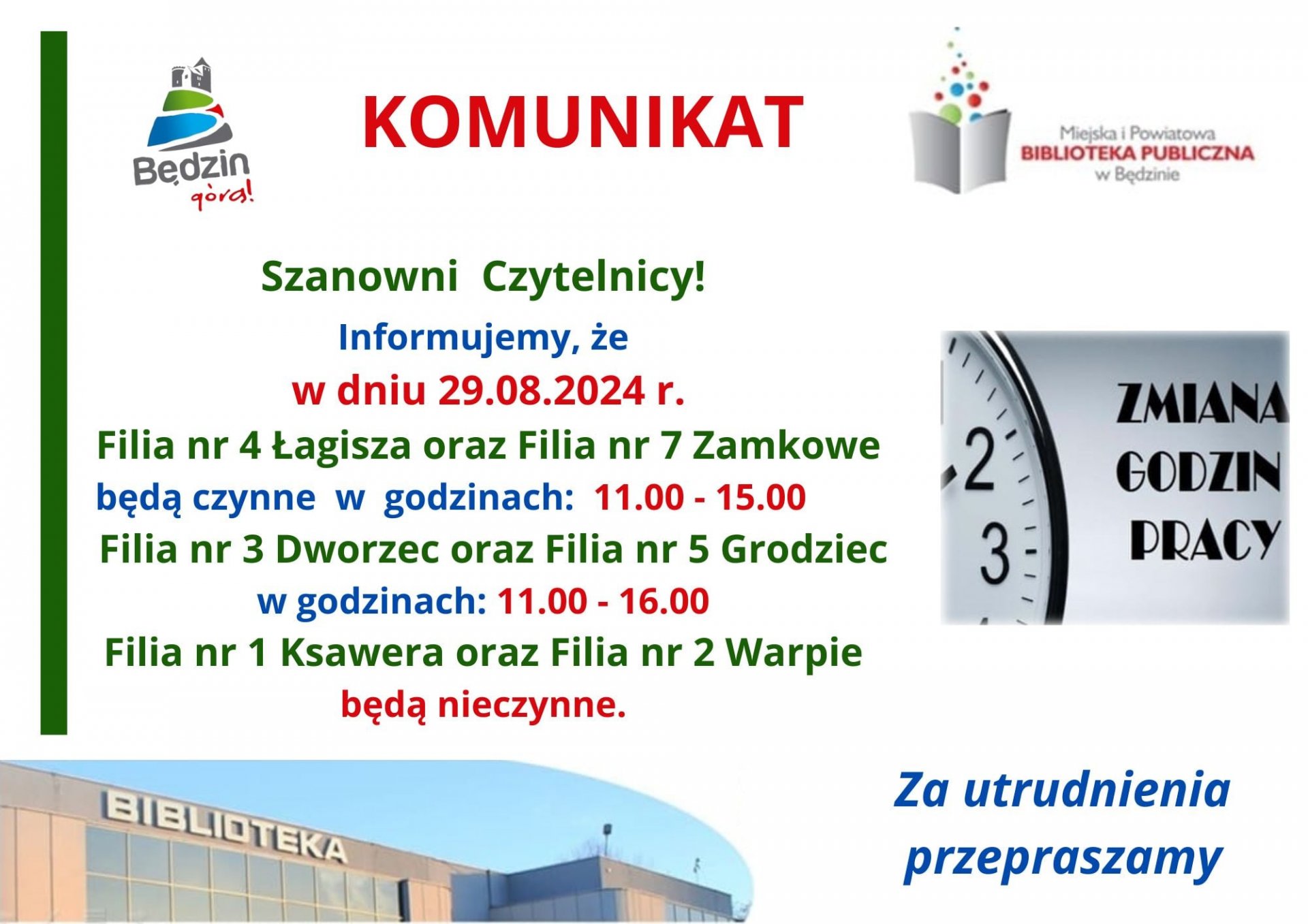 Komunikat dot. pracy Filii MiPBP w Będzinie w dniu 29 sierpnia (czwartek) br.