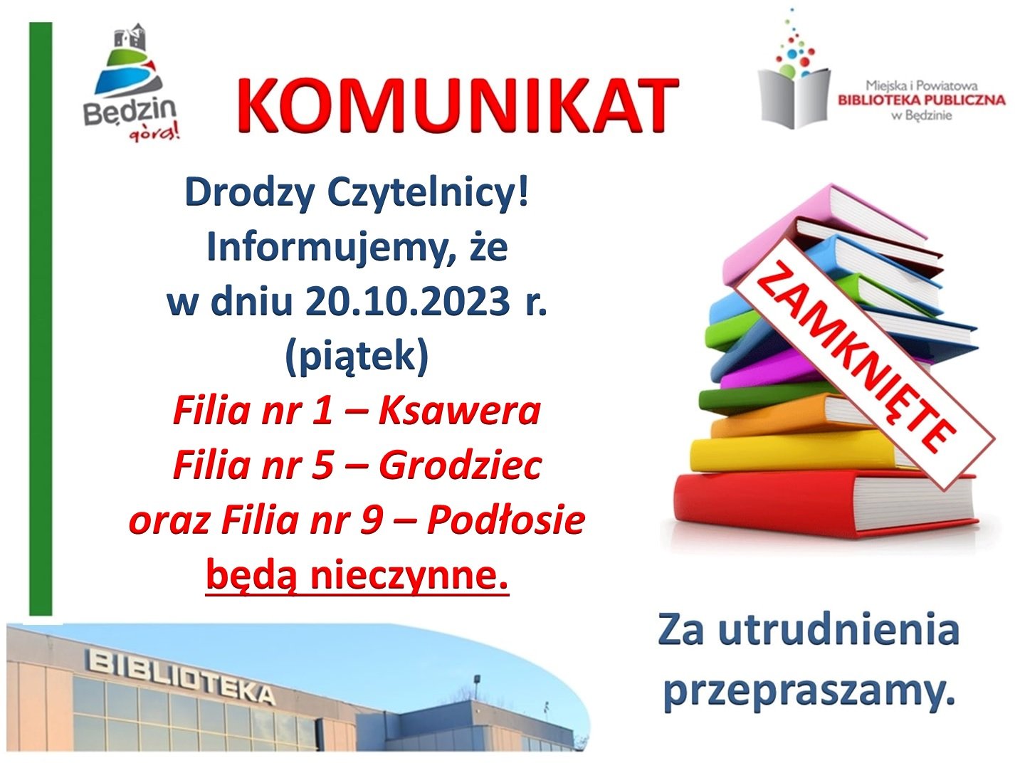 Drodzy Czytelnicy! Informujemy, że w dniu 20.10.2023 r. (piątek) Filia nr 1 – Ksawera, Filia nr 5 – Grodziec oraz Filia nr 9 – Podłosie będą nieczynne. Za utrudnienia przepraszamy.