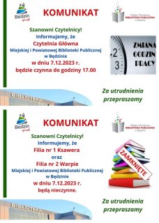 Szanowni Użytkownicy, informujemy że w dniu 7 grudnia 2023r. Filia nr 1 - Ksawera, Filia nr 2 - Warpie będą nieczynne. Czytelnia Główna będzie czynna do godziny 17.00.