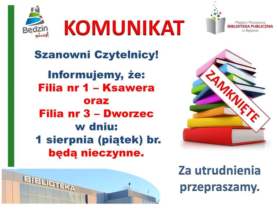 informujemy, że 1 sierpnia 2025 r. (piątek) Filia nr 1 - Ksawera oraz Filia nr 3 - Dworzec będą nieczynne.