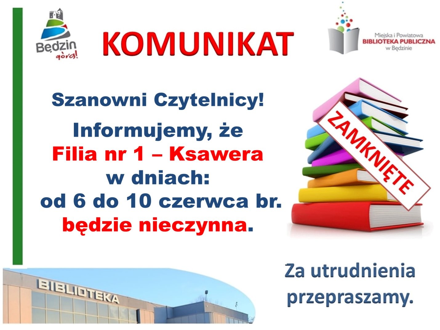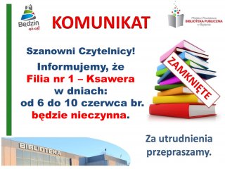 Szanowni Czytelnicy,informujemy, że w dniach od 6 do 10 czerwca br. Filia nr 1 - będzie nieczynna.Za utrudnienia przepraszamy.