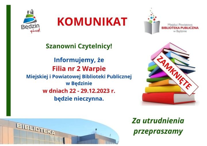 Szanowni Użytkownicy, informujemy że Filia nr 2 Warpie w dniu dzisiejszym (22.12.2023) będzie zamknięta.