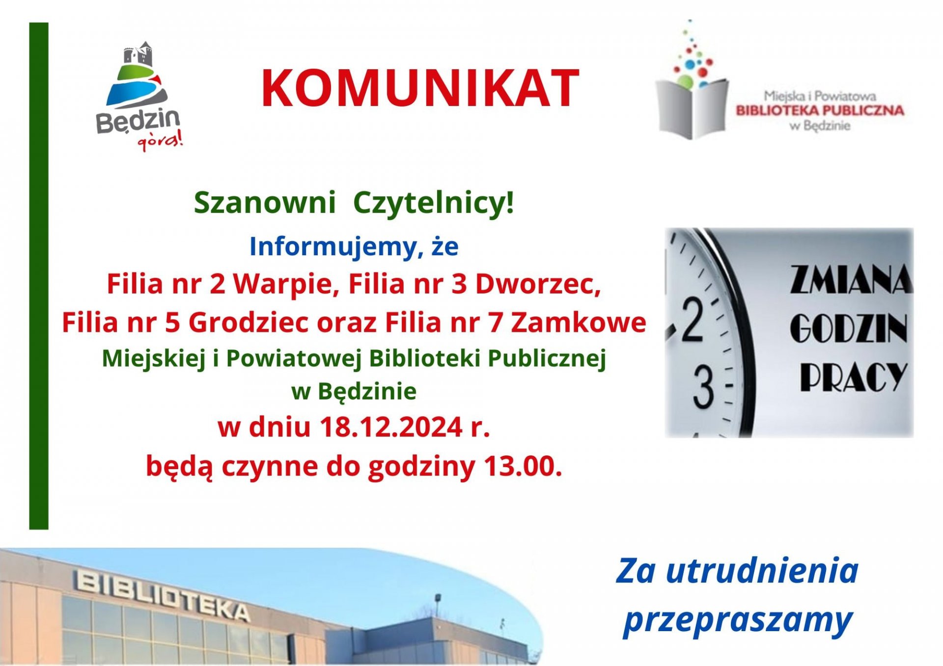 Komunikat dot. pracy Filii nr: 2-Warpie, 3-Dworzec, 5-Grodziec, 7-Zamkowe