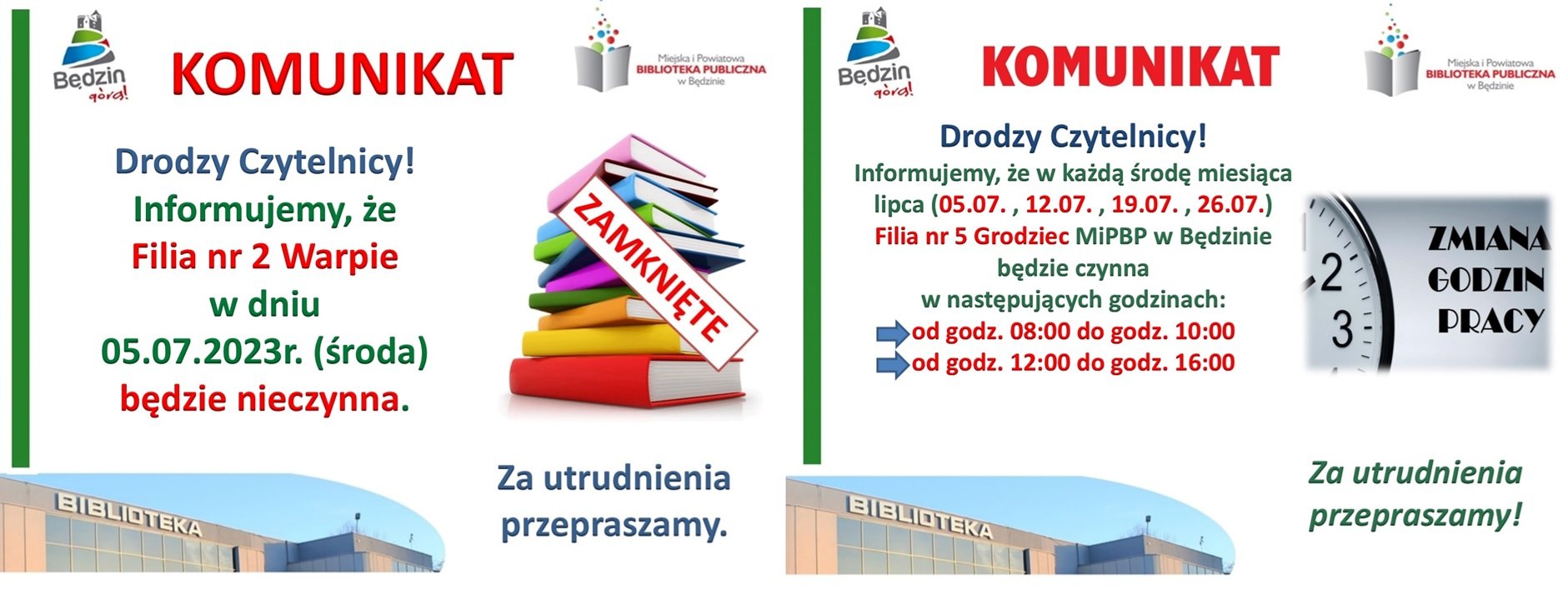 Komunikat dot. pracy Filii nr 2 - Warpie oraz Filii nr 5 - G...