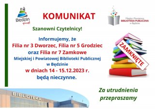 Szanowni Czytelnicy, informujemy, że w dniach 14 -15 grudnia → Filia nr 3 Dworzec → Filia nr 5 Grodziec → Filia nr 7 Zamkowe będą zamknięte. Za utrudnienia przepraszamy.
