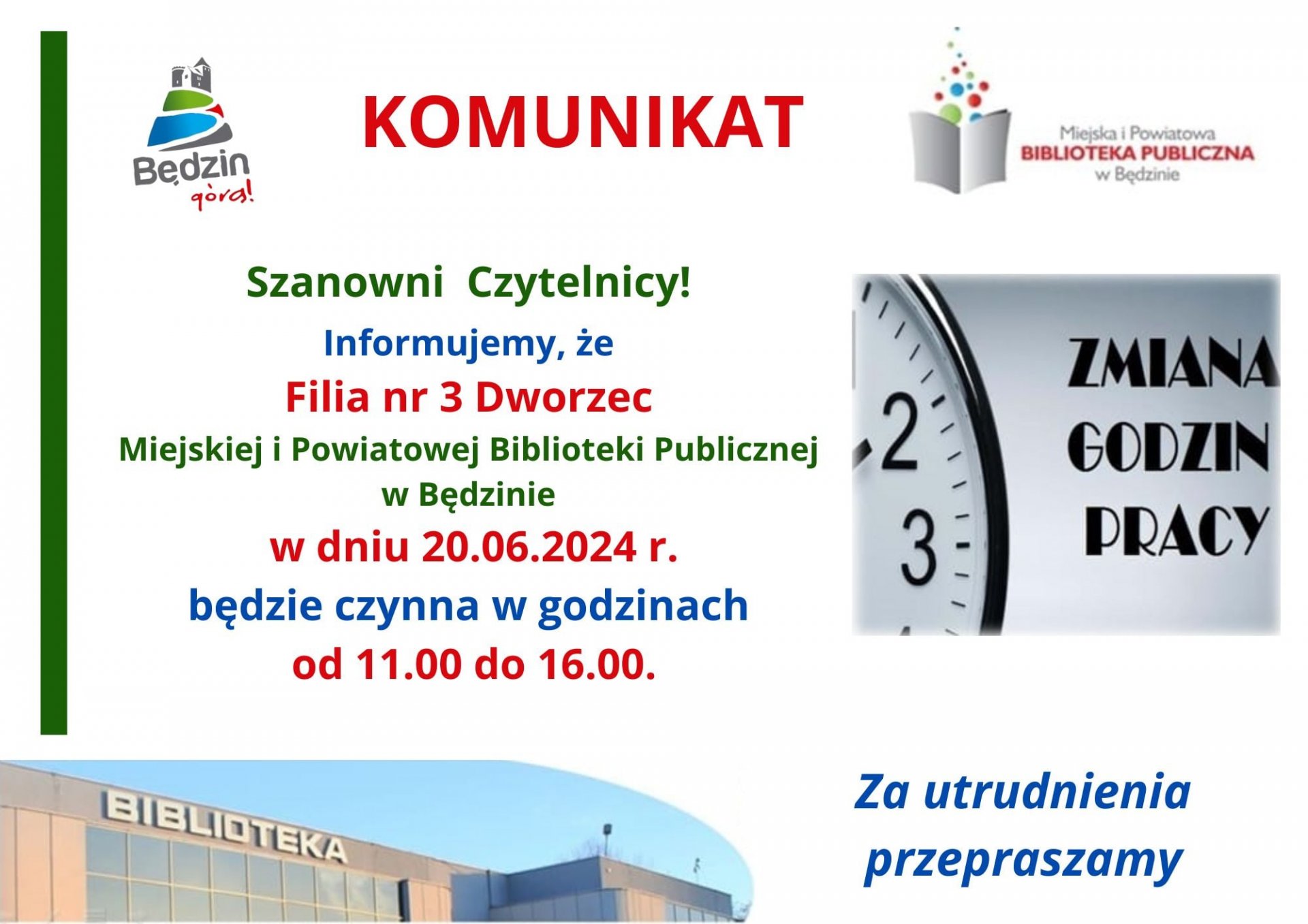 Szanowni czytelnicy, informujemy, że w dniu 20 czerwca br. Filiia nr 3 Dworzec będzie czynna w godzininach od 11:00 do 16:00. Za utrudnienia przepraszamy.