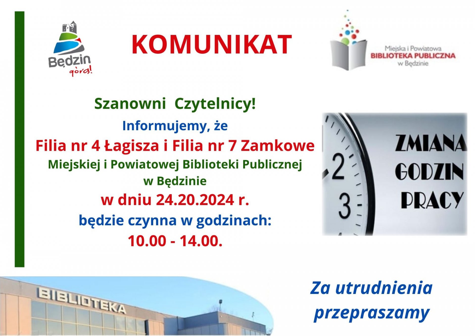 informujemy, że w dniu 24 października br. Filia nr 4 - Łagisza oraz Filia nr - 7 Zamkowe będą czynne w godzinach od 10.00 od 14.00.