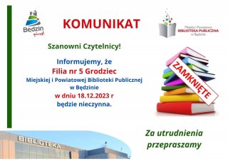 informujemy, że w dniu dzisiejszym (18.12.2023 r.) Filia nr 5 - Grodziec będzie nieczynna.