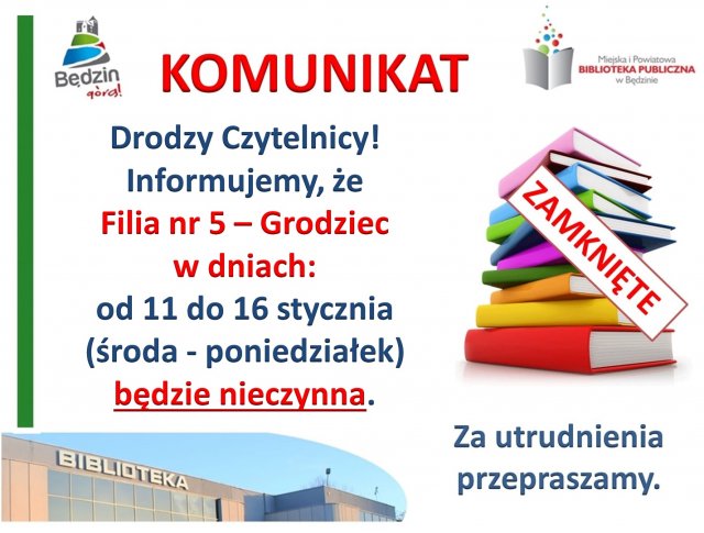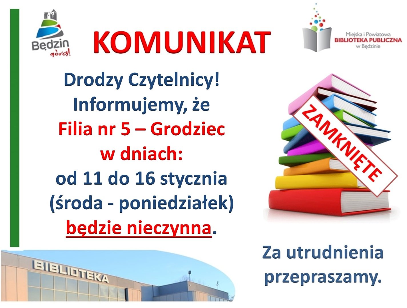 Komunikat dot. pracy Filii nr 5 - Grodziec w dniach od 11 do 16 stycznia br.