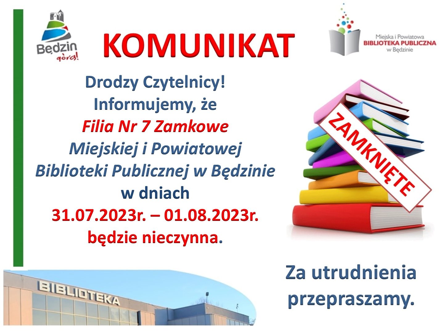 informujemy, że w dniach 31.07 - 01.08.2023 r. Filia nr 7 - Zamkowe będzie nieczynna.