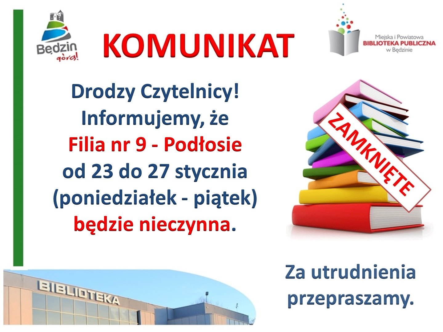 Szanowni Czytelnicy, inofrmujemy, że Filia nr 9 - Podłosie w dniach od 23 do 27 (poniedziałek - piątek) stycznia będzie nieczynna. Przepraszamy za utrudnienia.