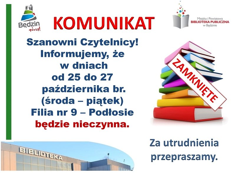 Informujemy, że w dniach od 25 do 27 października (środa - piątek) Filia nr 9 - Podłosie będzie nieczynna.