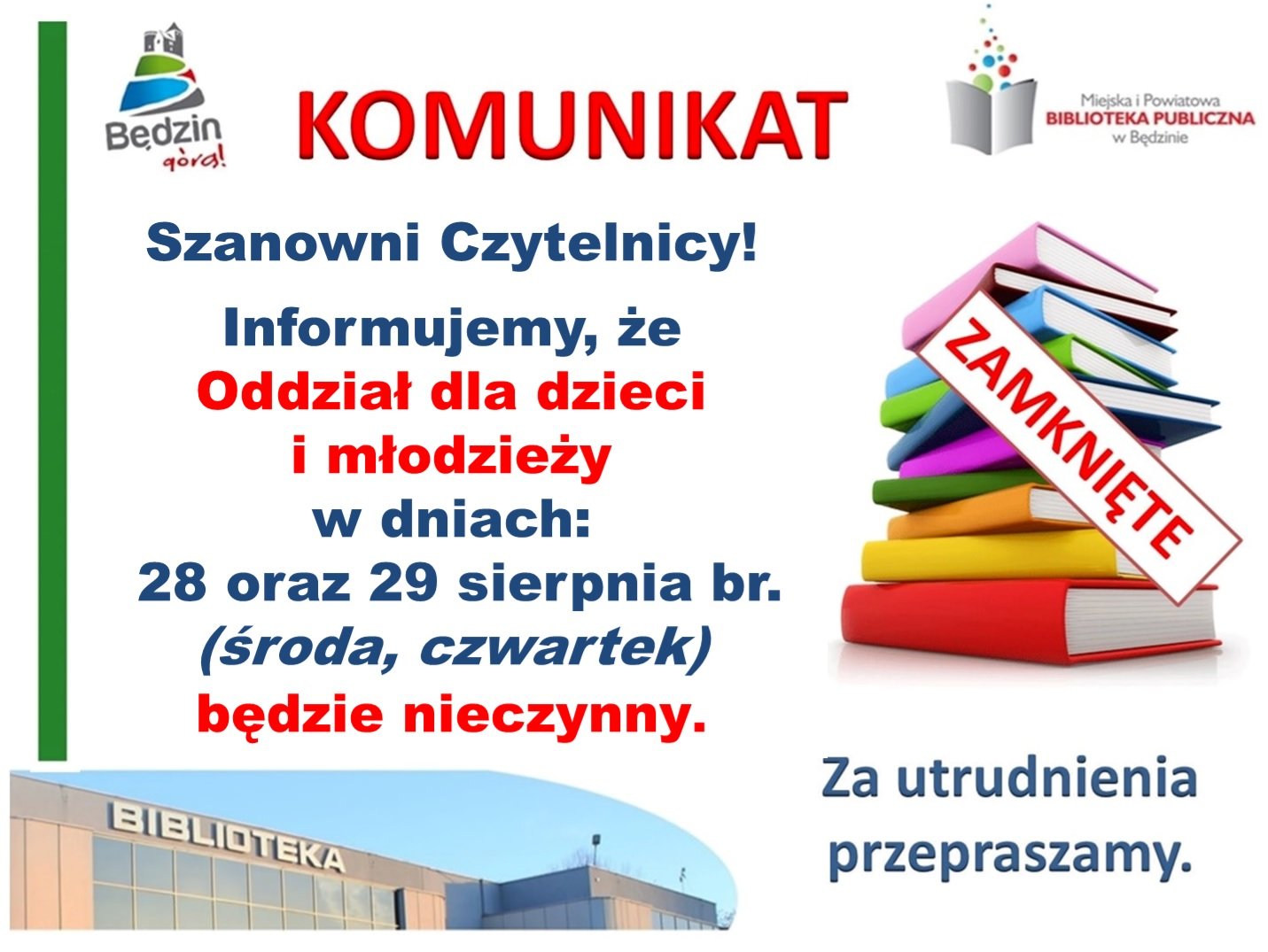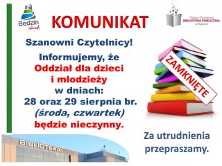 Szanowni Czytelnicy, informujemy, że Oddział dla dzieci i młodzieży w dniach 28 i 29 sierpnia (środa, czwartek) br. będzie nieczynny. Za utrudnienia przepraszamy.