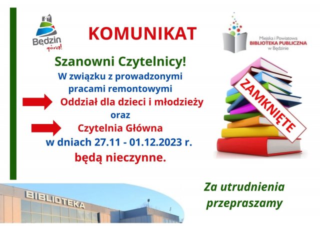 zgodnie z wcześniejszym komunikatem informujemy że w związku z montażem klimatyzacji (II etap zadania "Modernizacja i rozwój biblioteki" realizowanego w ramach projektu MKiDN)