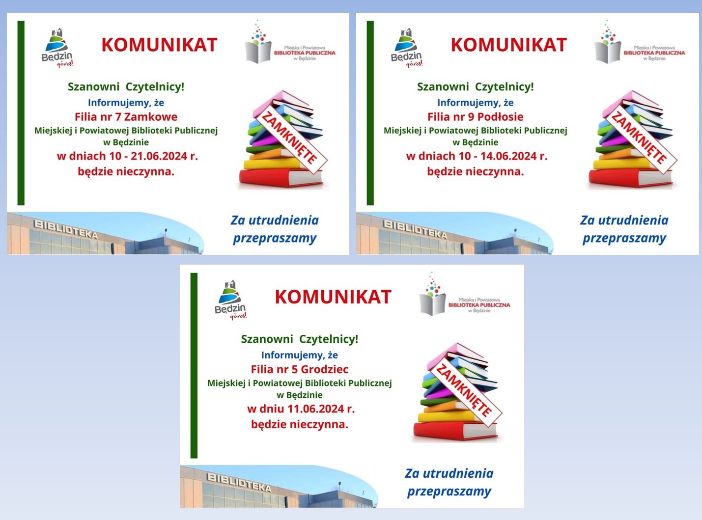 Komunikat dot. zamknięcia filii MiPBP w Będzinie w dniu 11 czerwca oraz w dniach kolejnych.