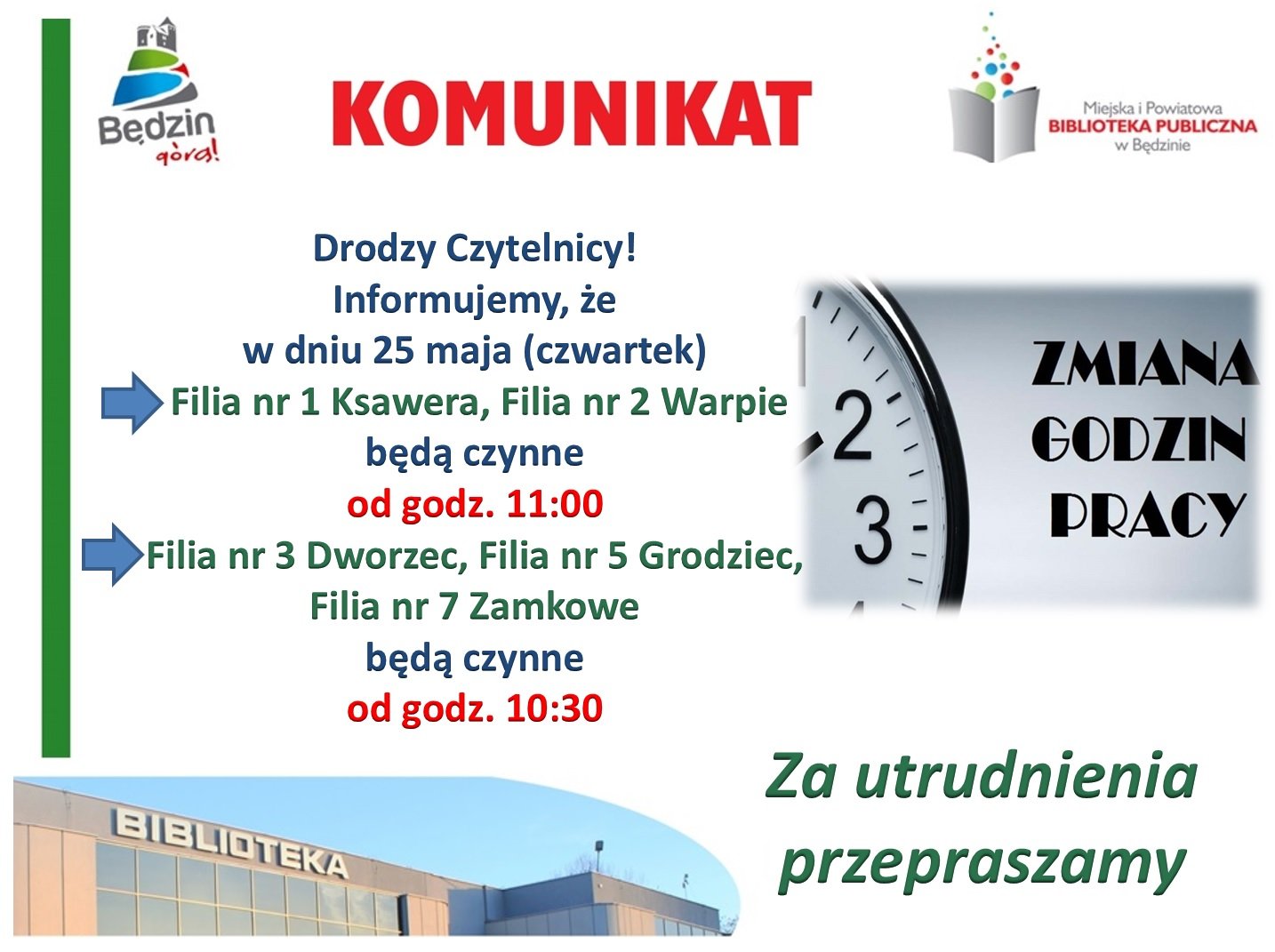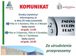 Komunikat dot. zmian godzin otwarcia filii bibliotecznych w dniu 25 maja br.