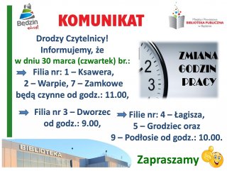 Komunikat dot. zmiany godzin otwarcia biblitecznych filii w dniu 30 marca br.