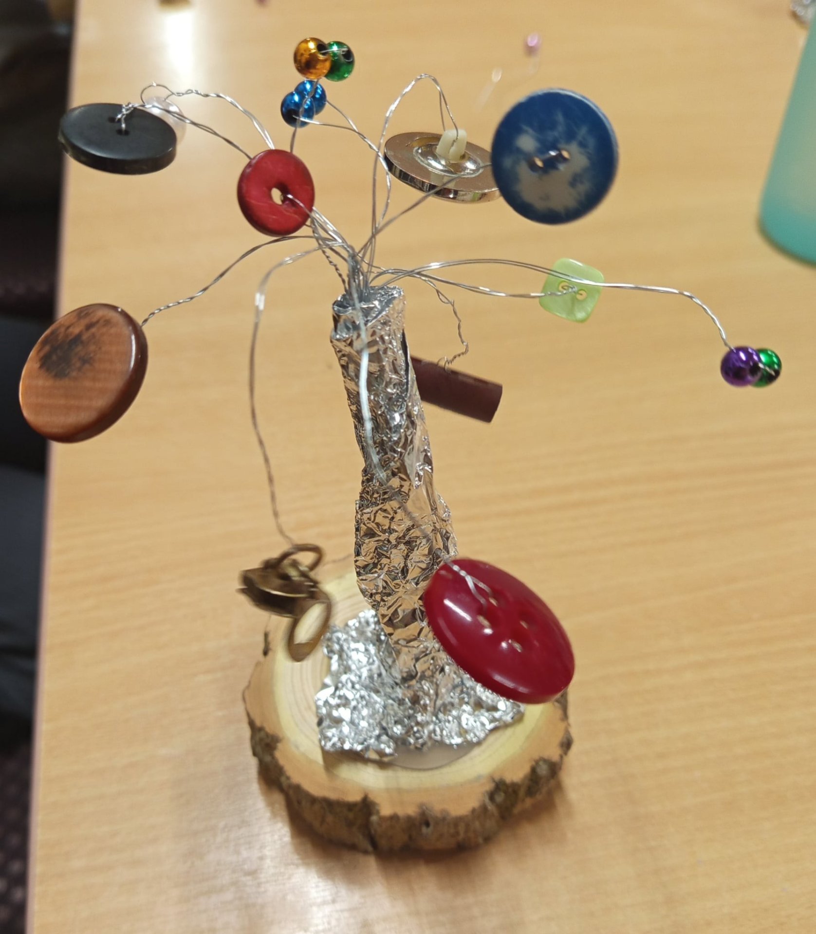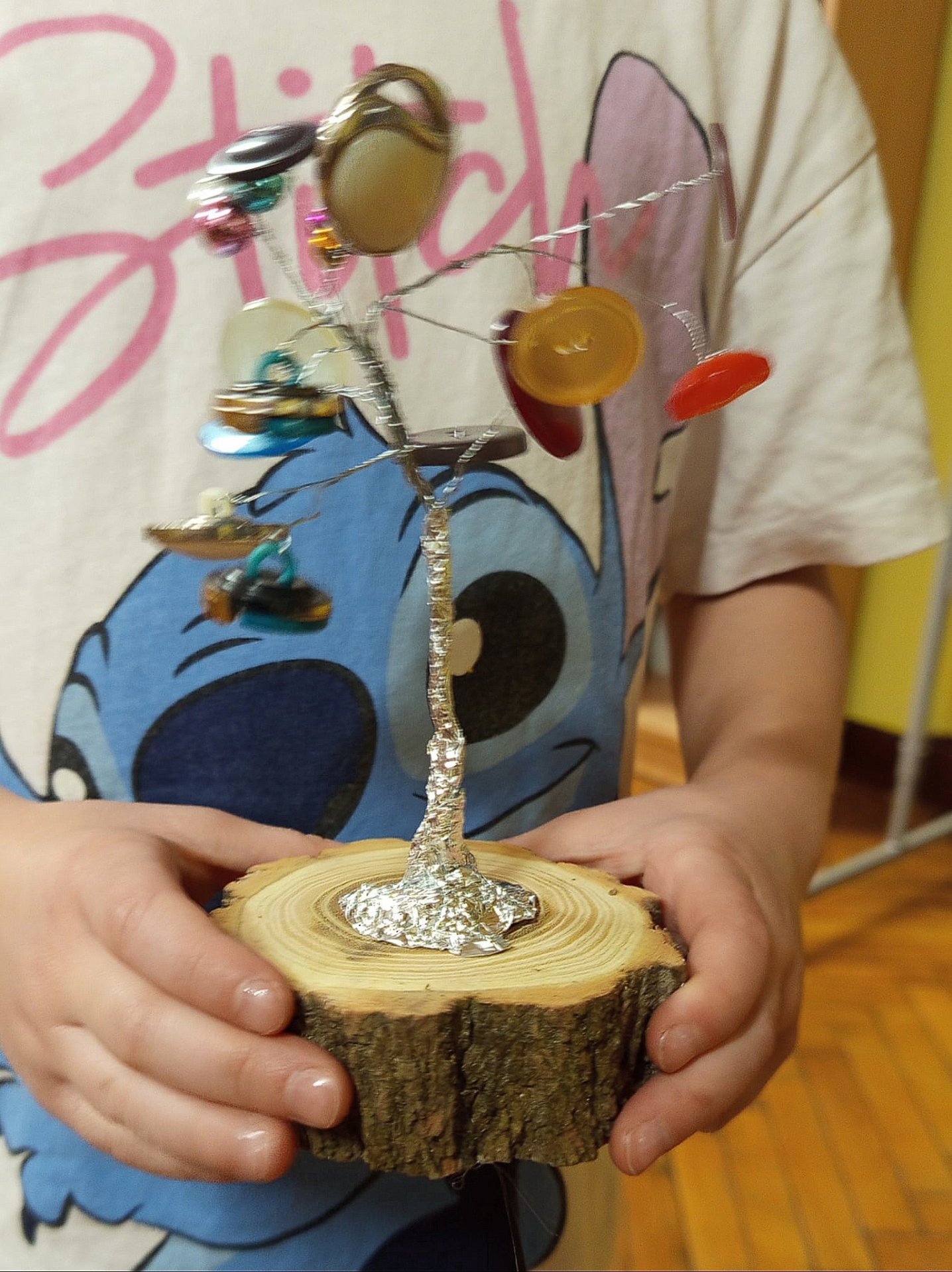 Z tej okazji grudniowe spotkanie kreatywnych zajęć literackich dla dzieci "Fantazja" bibliotekarka Filii nr 1 Ksawera zadedykowała właśnie guzikom. Guzik w literaturze i historii - złapany na widok kominiarza czy znaleziony na drodze – guzik od wieków jest symbolem szczęścia i pomyślności. Jak opowiada Charles Panati w "Niezwykłych dziejach zwykłych rzeczy", guzik ma dla ludzkości znaczenie już od setek lat. Guzik ma również swoje szczególne miejsce w "Akademii Pana Kleksa". Kto pamięta słynne guziki w Akademii? My poszliśmy tropem tej magii. Odkryliśmy fascynującą książkę Michała Rusinka "Guzik : o Janie Brzechwie dla dzieci", która opisuje, że podobnie jak Adaś Niezgódka z popularnej lektury szkolnej, mały Janek Brzechwa był kolekcjonerem guzików. Zdobył nawet egzemplarz od płaszcza naczelnika stacji kolejowej, w sposób którego oczywiście nie pochwalamy. To wspaniała opowieść o życiu, twórczości i inspiracjach autora jednej z ulubionych książek dzieci. Podczas zajęć uczestnicy zainspirowani tym magicznym przedmiotem, stworzyli przepiękne guzikowe drzewka szczęścia.