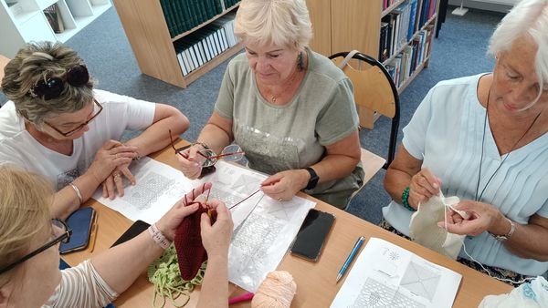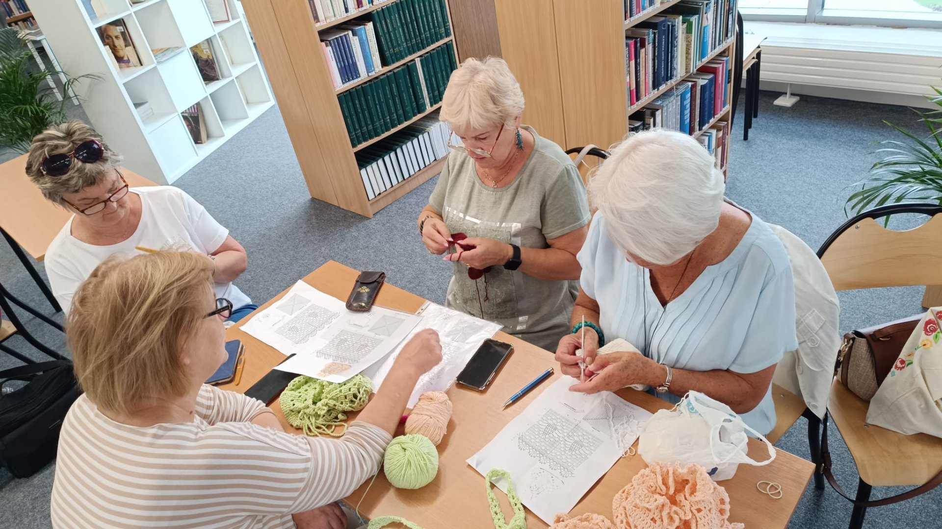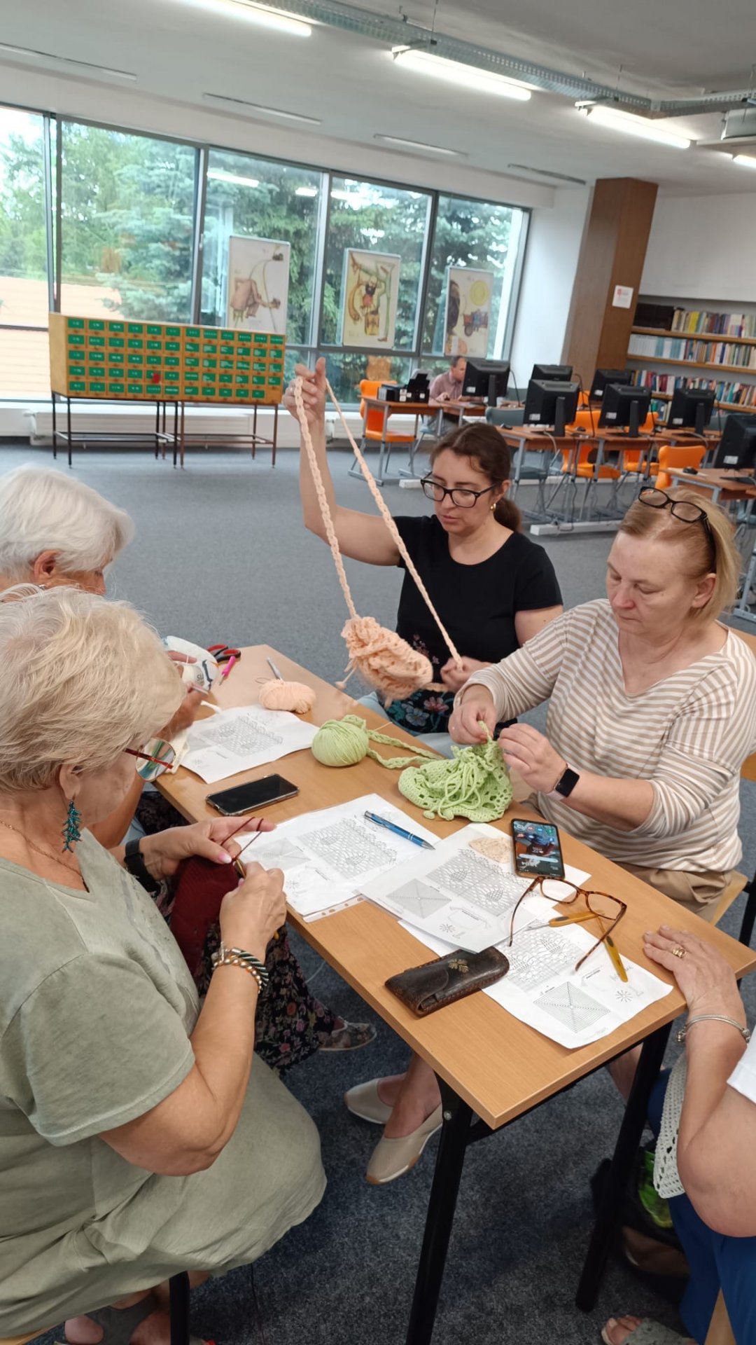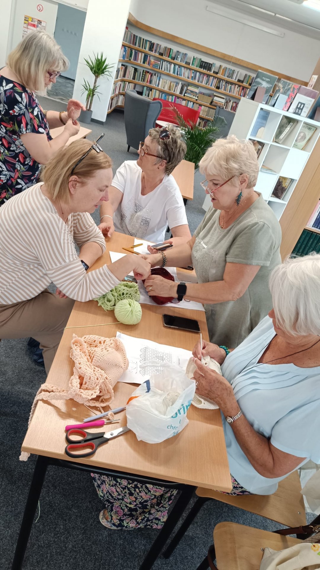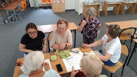 W piątkowe południe 24 maja uczestniczki warsztatów kontynuowały dzierganie torebki - sakiewki, nad którą pracę rozpoczęły miesiąc temu. Tym razem szydełkowane były boki torebki. Jeszcze tylko wykończenie - sznureczek do ściągnięcia oraz pasek na ramię i piękna, własnoręcznie wykonana torebka gotowa.